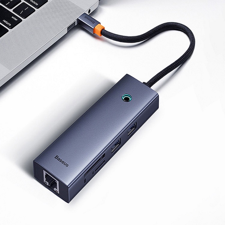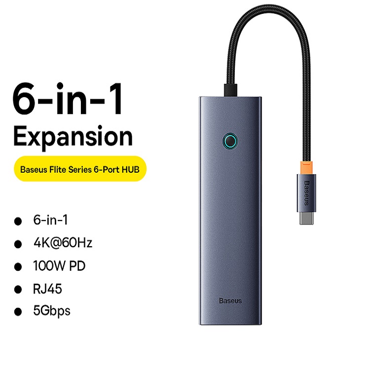 Multihub-ul 6 in1 UltraJoy Type-C de la Baseus, dispune de 3 porturi USB 3.0 pentru viteze de transfer de date de pana la 5 Gbps, are un port HDMI care accepta rezolutia 4K@60Hz, si o mufa RJ45 pentru viteze de conectare ultrarapide de pana la 1.000 Mbps.