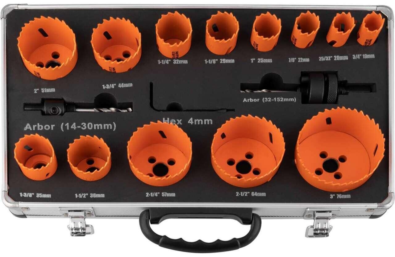 Setul include toate cele mai frecvent utilizate dimensiuni cuprinse intre 19 si 76 mm (¾ - 3”), tije de ghidaj pentru diferite diametre si un adaptor.
