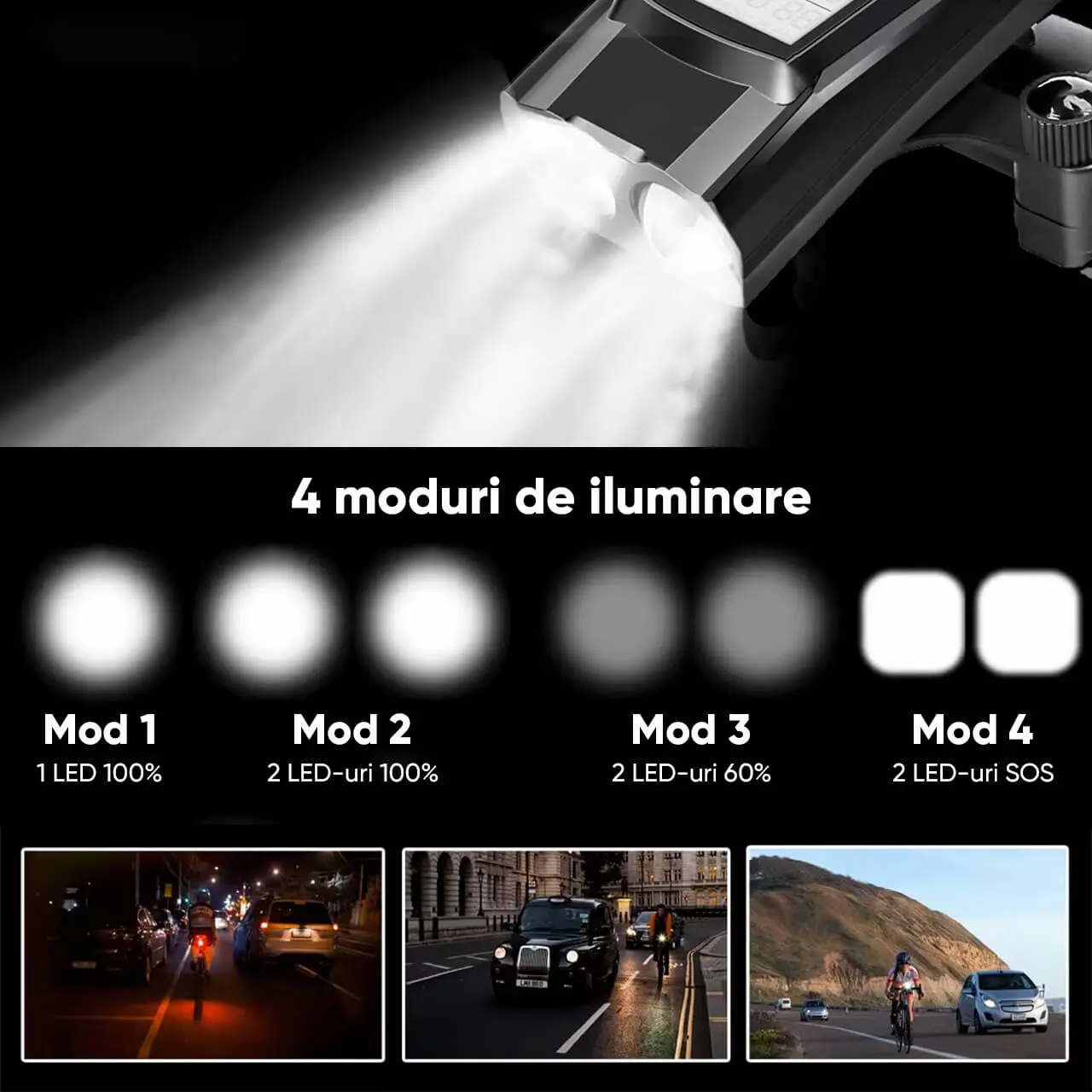 Functia de lumina frontala puternica cu LED-uri va ofera 4 moduri de iluminare, ajustabile in functie de nevoie si de conditiile de drum.