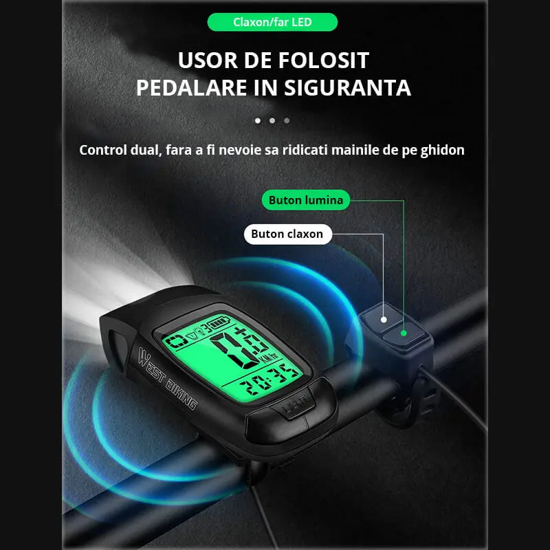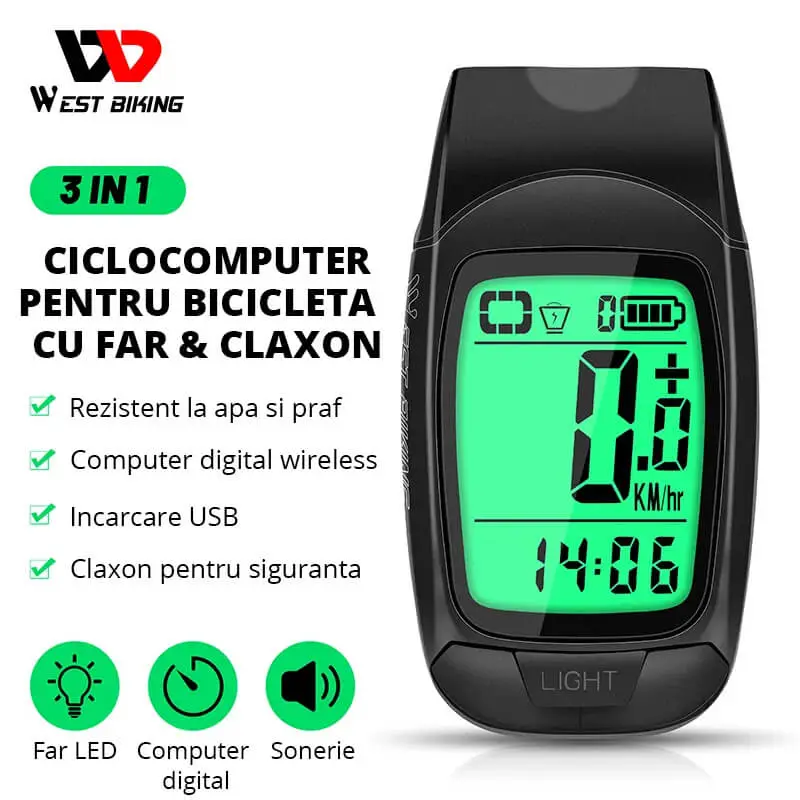 Ciclocomputerul de la West Biking este un produs multifunctional 3 in 1: computer digital, far si claxon, foarte util biciclistilor, compatibil cu toate tipurile de biciclete.