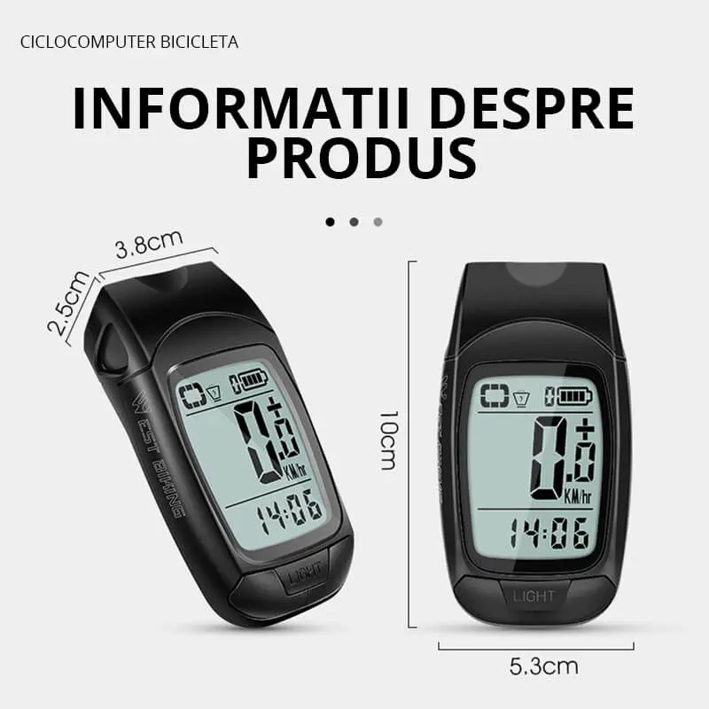 - Accesorii incluse: 1 x ciclocomputer, 1 x suport de fixare pentru ghidon, 1 x suport de fixare ajustabil, 1 x senzor,
