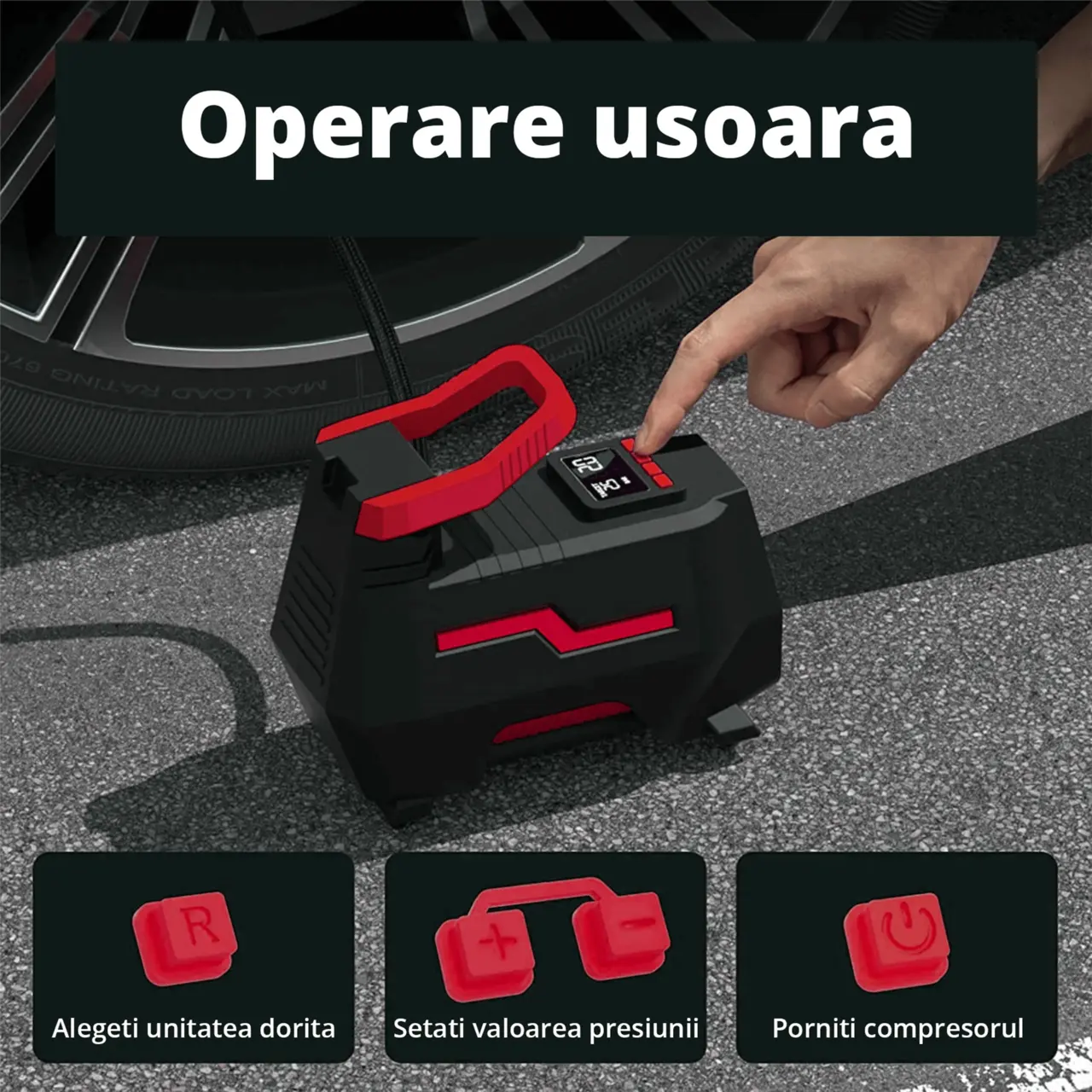 - Compresorul are un ecran digital clar, care arata simultan presiunea presetata a anvelopei si presiunea in timp real.