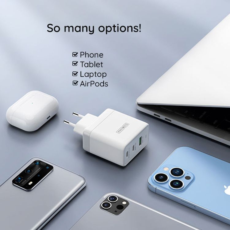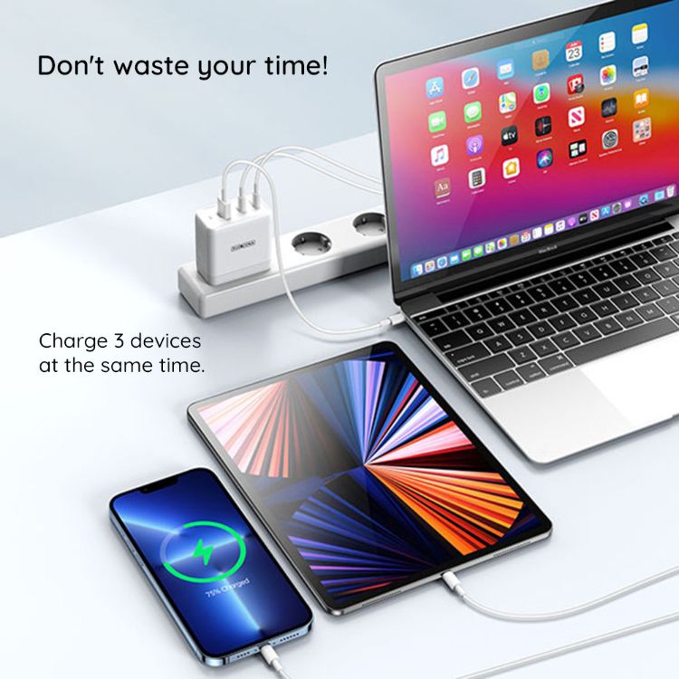 Incarcatorul Retea GaN Fast Charging USB, 2x Type-C de la Duzzona, ofera o incarcare rapida fiind echipat cu doua porturi de incarcare USB-C si un port USB-A, incarcatorul ofera o putere maxima de iesire de 65 W pentru a incarca dispozitivele dumneavoastra mult mai rapid.