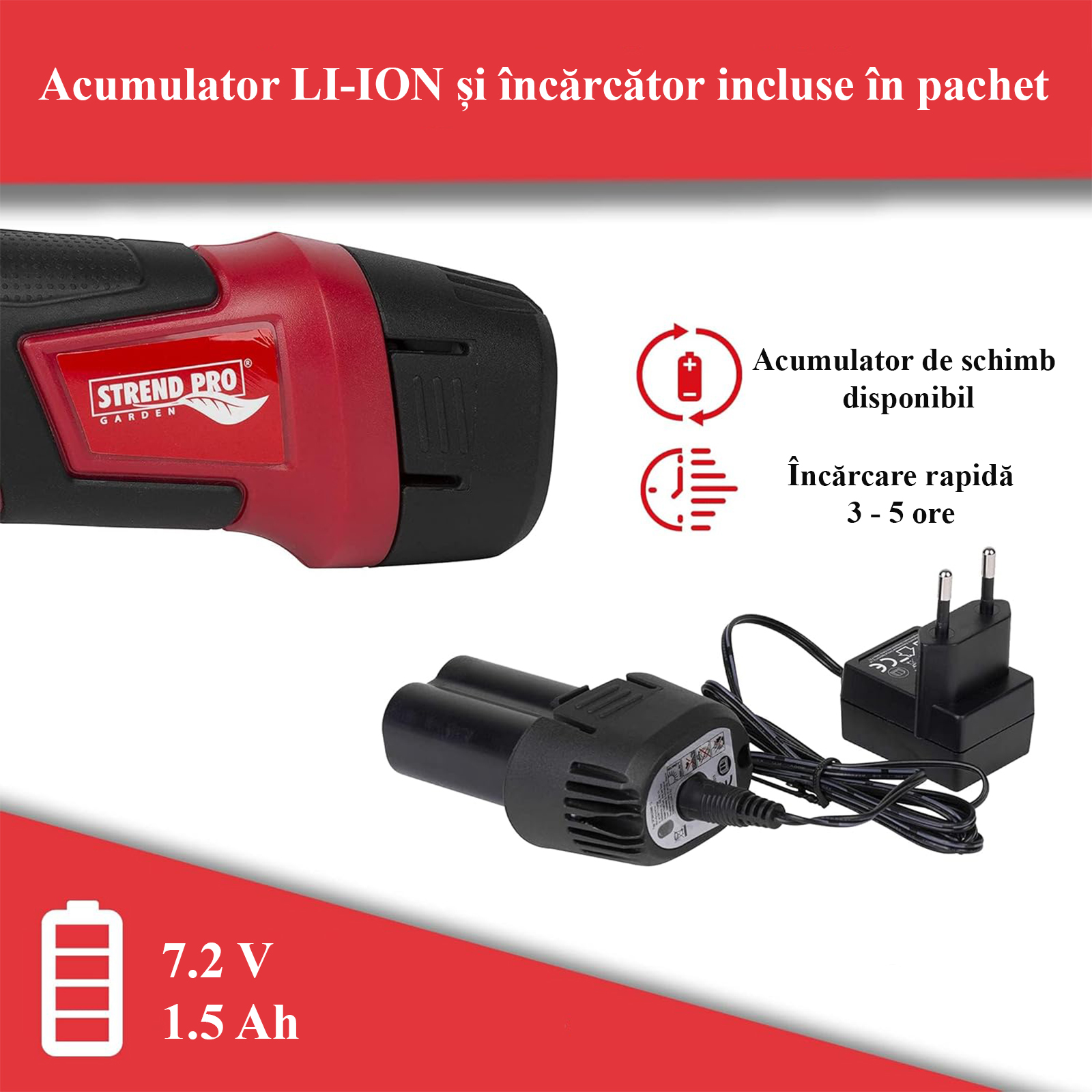 Foarfeca electrica de gradina, cu acumulator 1.5 Ah, incarcator 7.2 V, maner telescopic, Strend Pro