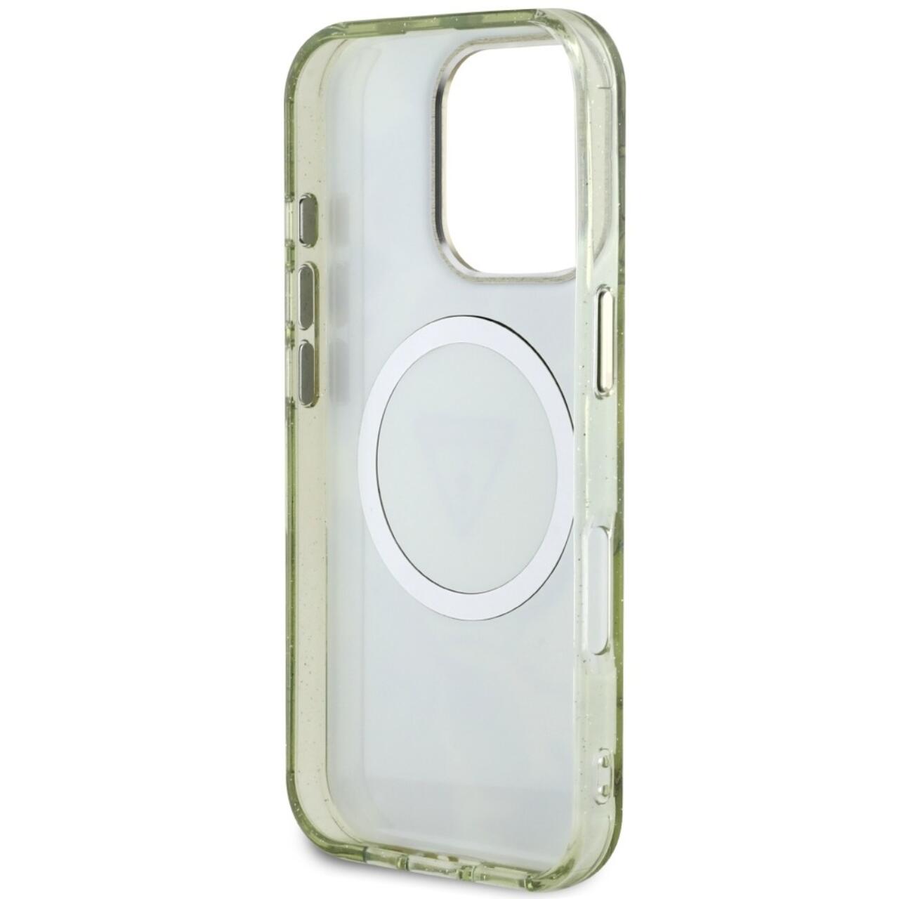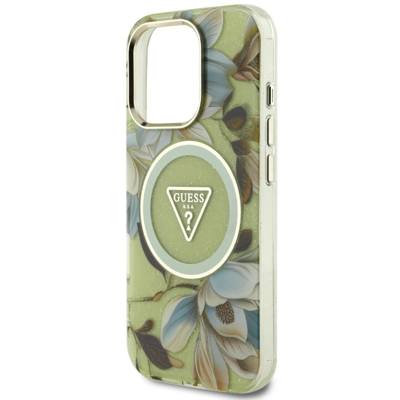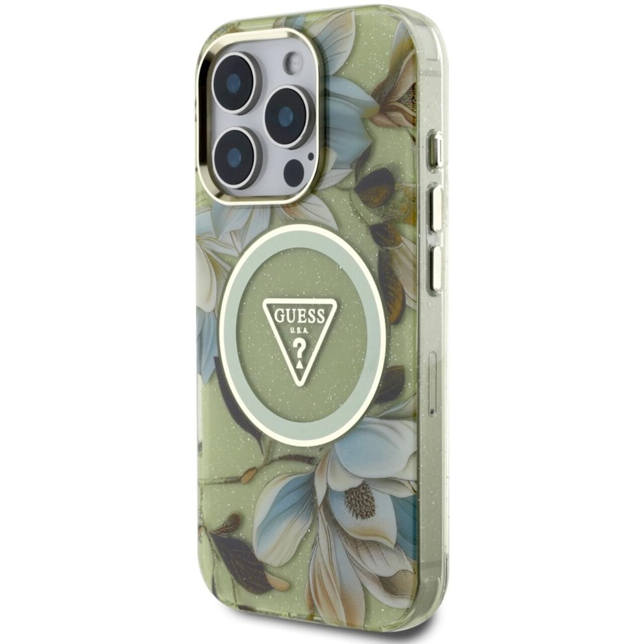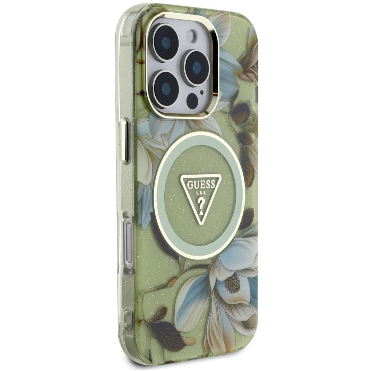 Guess Husa Glitter Flowers Triangle Buttons MagSafe iPhone 16 Pro Verde