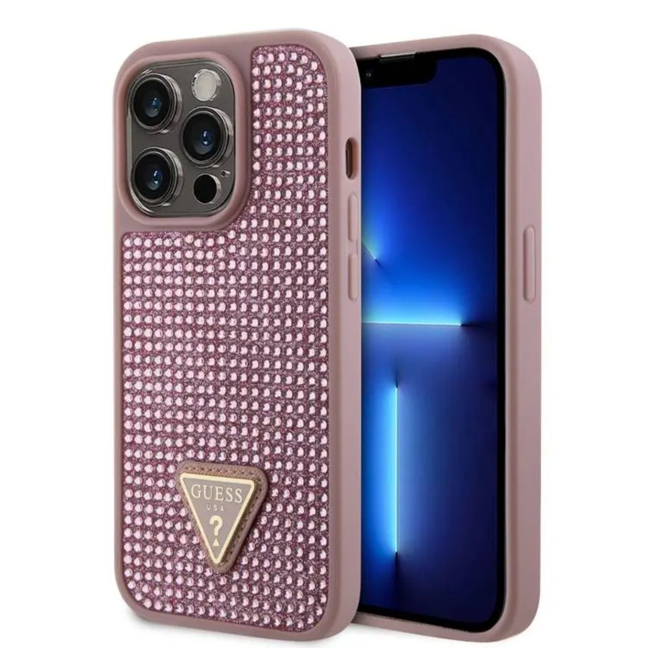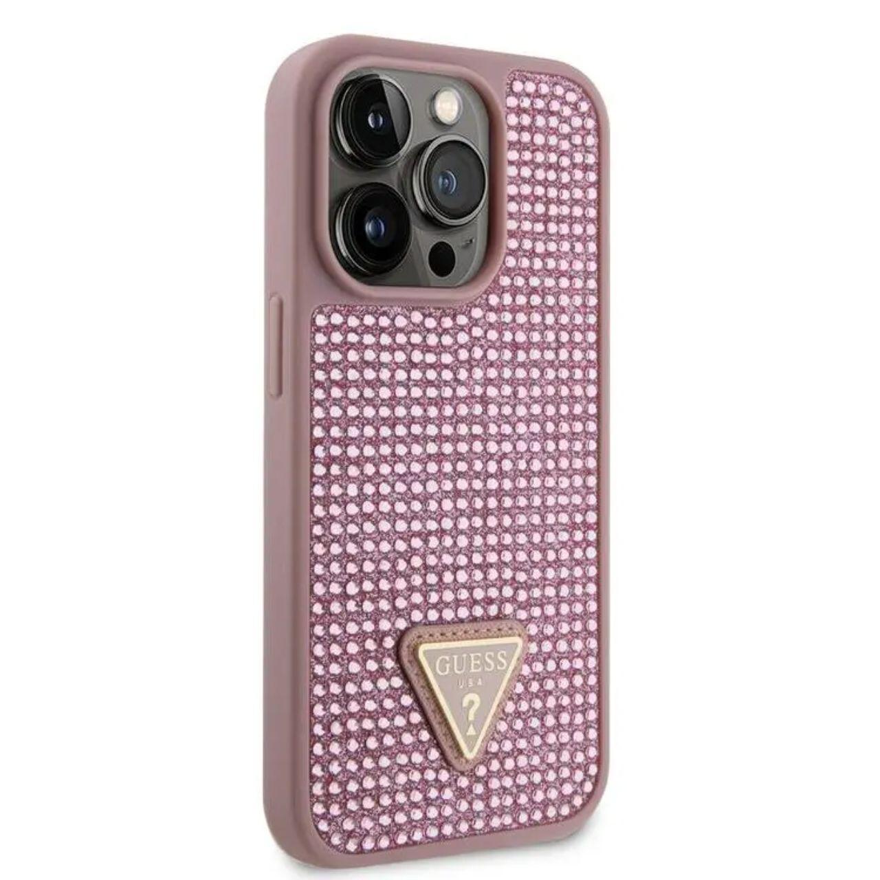 Guess Husa Rhinestones Triangle Metal Logo iPhone 15 Pro Roz