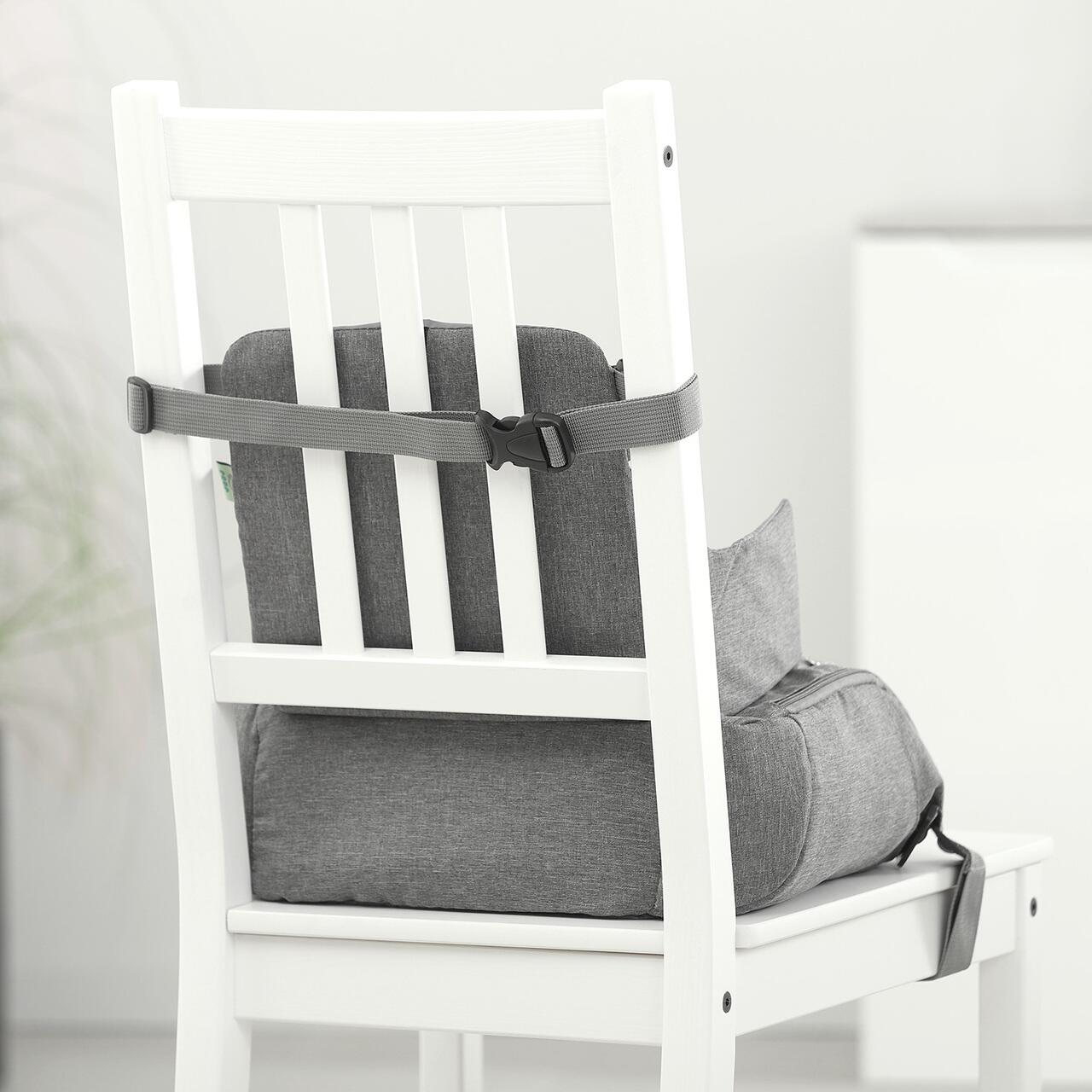 Inaltatorul de scaun se prinde de scaun cu curelele stabile, reglabile, cu cleme de fixare. Curelele permit folosirea si ca geanta de umar De asemenea, copilul este asigurat cu o centura de siguranta in 3 puncte. Produsul respecta standardul de siguranta EN16120 pentru scaune si inaltatoare de masa pentru copii.