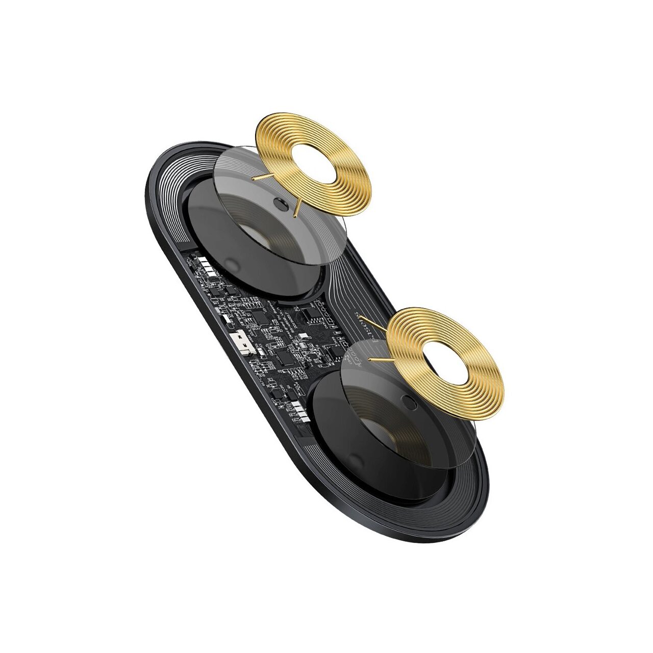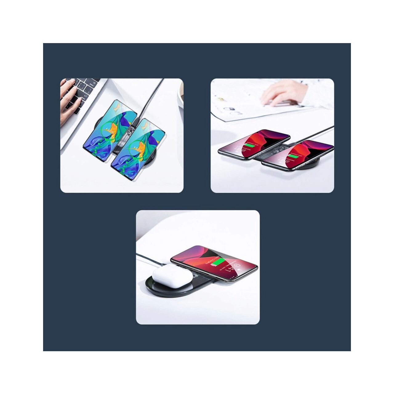 Incarcatorul Simple 2 in 1 Wireless de la Baseus are dimensiuni reduse si un design elegant, slim, avand doar 8 mm grosime. Permite incarcarea a doua dispozitive compatibile QI (incarcare wireless) simultan. Trebuie doar sa asezati dispozitivele pe stand si incarcarea porneste. Puterea maxima totala este de 15W atunci cand incarcati simultan doua dispozitive sau 10W Max pe o parte. Incarcatorul adapteaza automat in functie de dispozitivul de incarcat puterea. De exemplu pentru doua telefoane Android 10W + 5W, pentru doua iPhone 7.5W + 7.5W sau un iPhone si castile Airpods 7.5W + 2.5W.