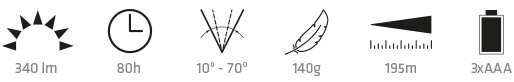 Lanterna este echipata cu un pachet de baterii minimizat care contine 3 baterii AAA. În plus, pastrarea unui sistem de control complet electronic, întrerupator durabil si eficienta dovedita pe curba luminii - ofera cel mai bun raport putere / cost.