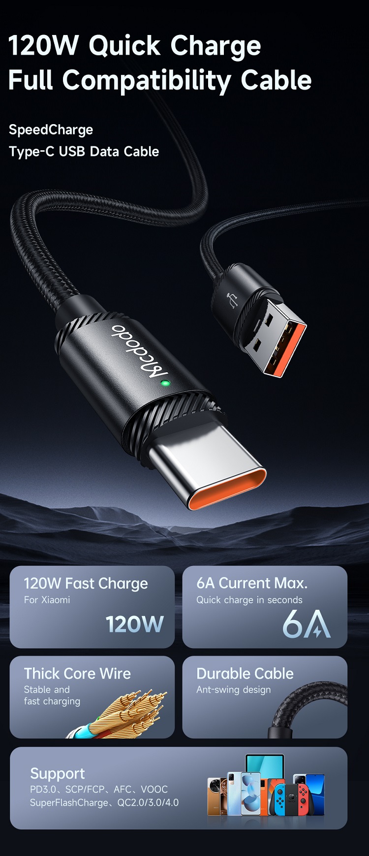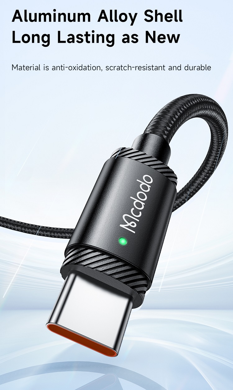 Cablul USB-A la Type-C SpeedCharge Series de la Mcdodo ofera incarcare stabila si rapida: miez incorporat de cupru pur, conductivitate buna, incarcare rapida fara incalzire si transfer rapid de date: viteza de transfer al fisierelor este de pana la 480 MB/s, permitandu-va sa mutati imagini, documente si videoclipuri intr-un timp scurt.