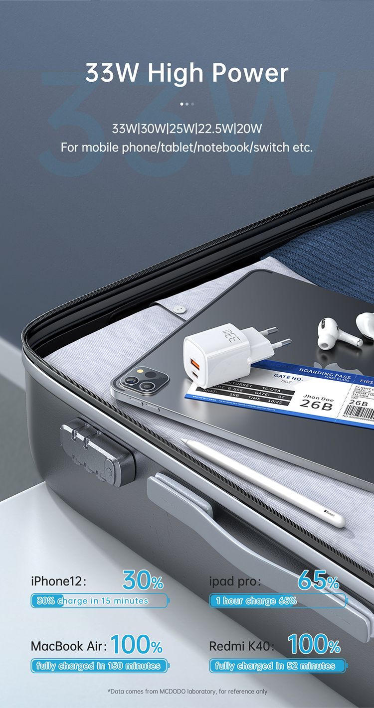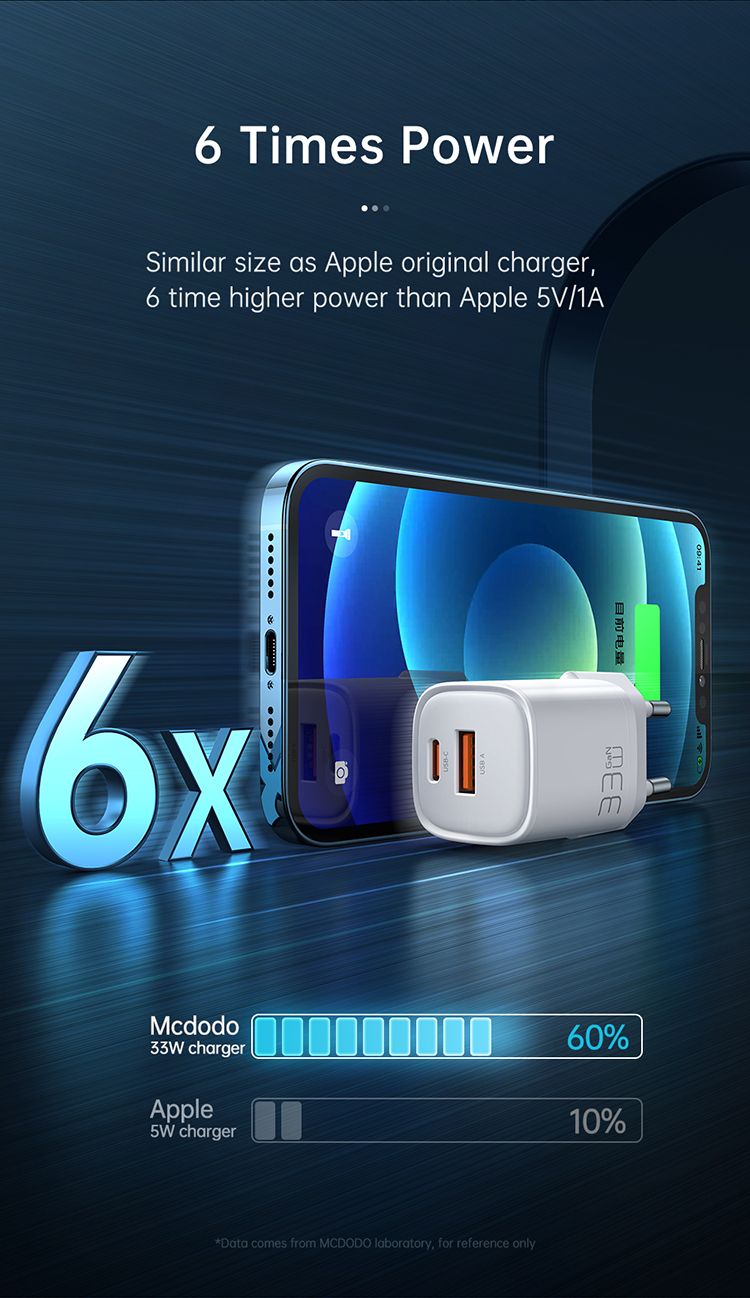 Incarcatorul Retea Dual Port USB-A si Type-C Nano Series GaN Fast Charging PD, de la Mcdodo are un n design elegant, minimalist si cea mai recenta tehnologie GaN. Cu o putere de pana la 33 de wati si o greutate mica, il poti folosi pentru a-ti incarca nu doar smartphone-ul, ci si laptopul sau alte dispozitive.