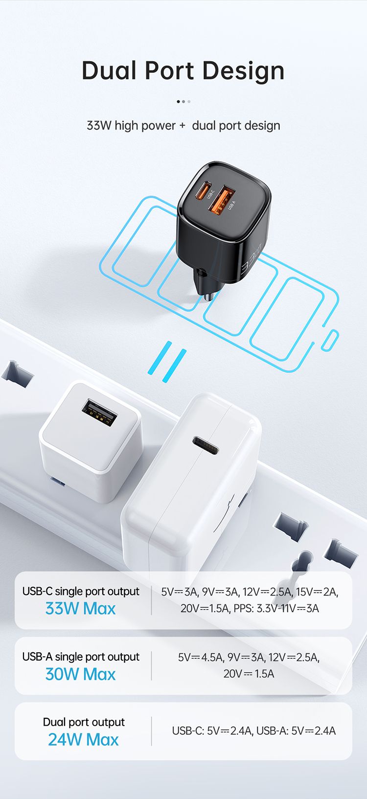 - iesire USB-C: 5V, 3A/9V, 3A/12V, 2.5A/15V, 2A/20V, 1.5A, PPS: 3.3V-11V, 3A, 33W Max