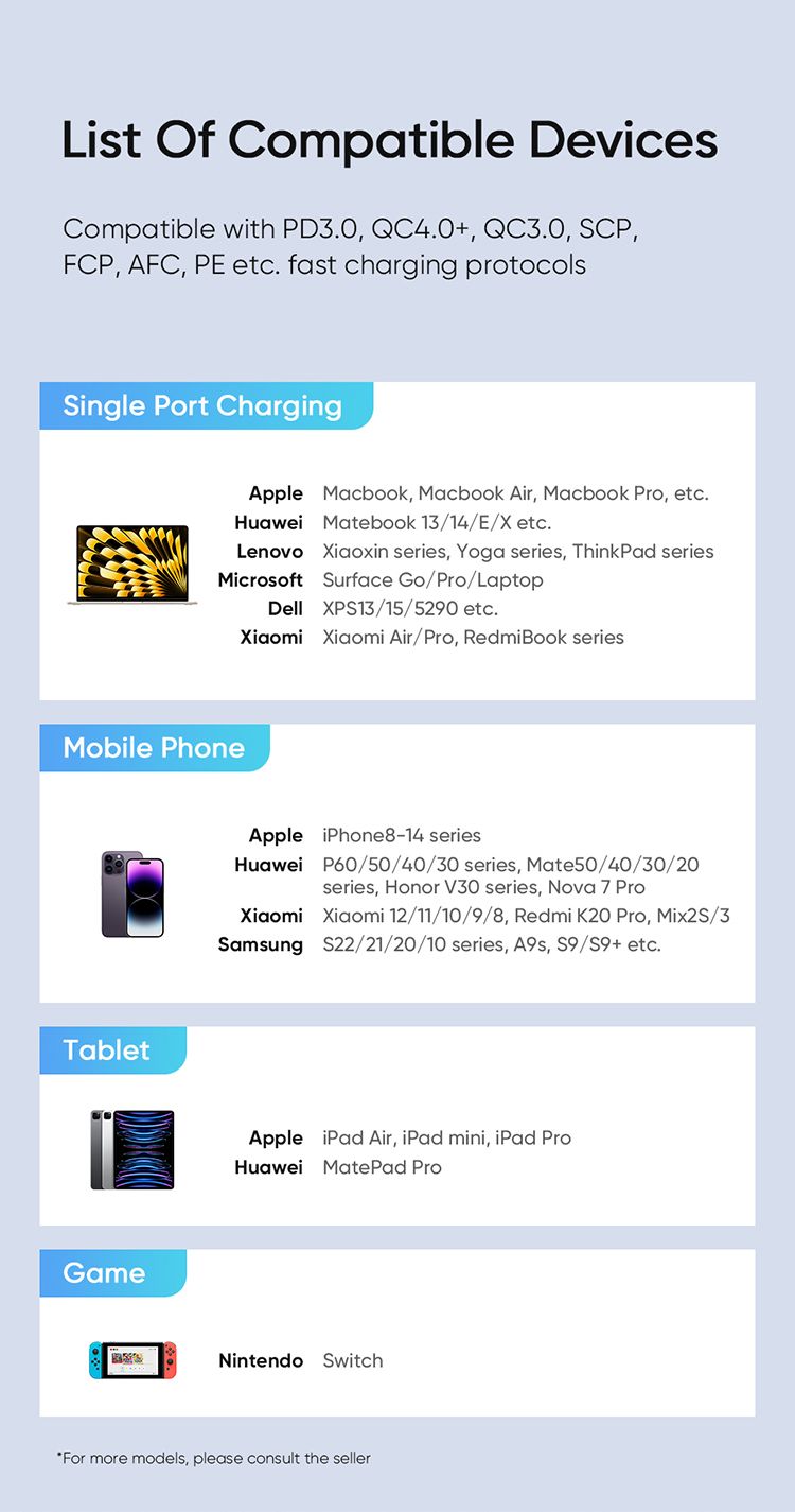Nu trebuie sa va faceti griji cu privire la deteriorarea echipamentului, deoarece incarcatorul de alimentare a fost facut cu atentie la fiecare detaliu. GaN este responsabil pentru mentinerea temperaturii optime si a functionarii eficiente, iar utilizarea materialelor de inalta calitate face ca dispozitivul sa fie complet sigur si rezistent la uzura.