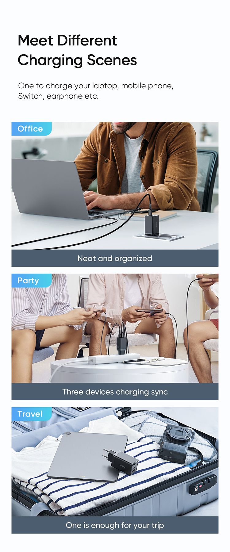 Incarcatorul Retea GaN5 Mini Pro Fast Charger are putere mare de 67 W, potrivit pentru telefonul mobil/tableta/laptop/consola de jocuri, designul cu trei porturi: USB-A si 2 USB-C va permite sa incarcati 3 dispozitive in acelasi timp.