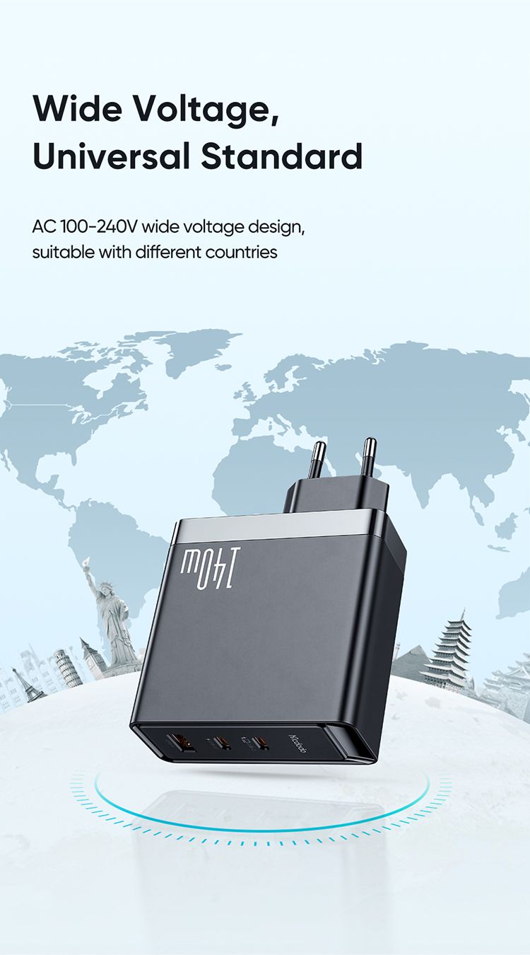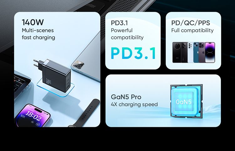 Incarcatorul se remarca prin compatibilitatea sa larga si accepta protocoale populare de incarcare rapida. In functie de portul selectat, acesta ofera o sursa de alimentare de 140W/100W/60W, astfel incat va va reface in siguranta telefoanele, laptopurile si alte dispozitive.