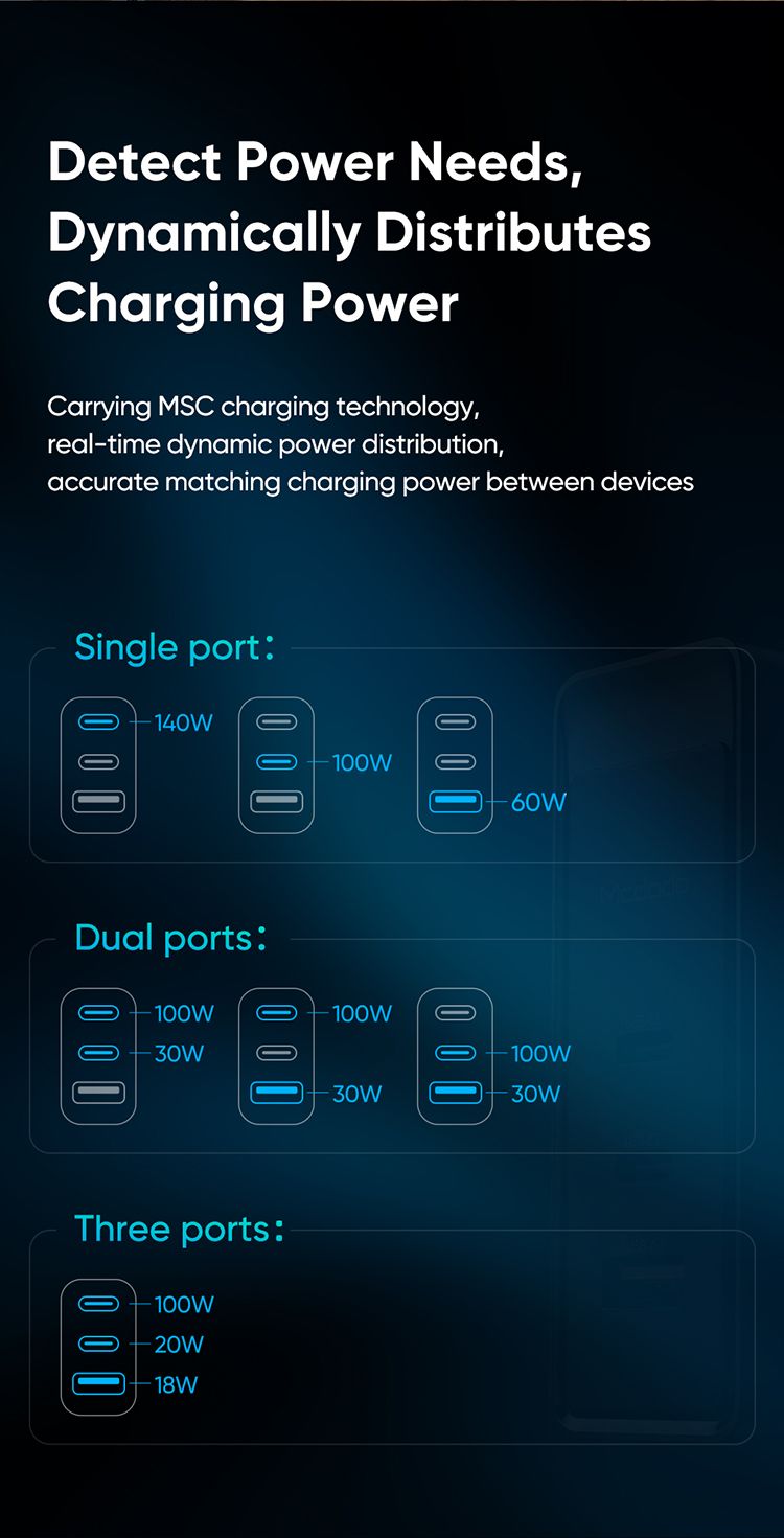 - USB-C1+USB-C2+USB-A: 100W+20W+18W