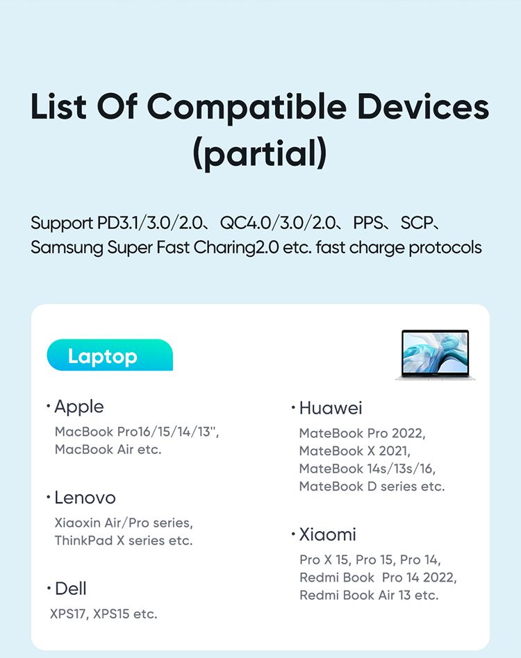 - tensiunea de iesire:USB-C1: 5V⎓3A(15W), 9V⎓3A(27W), 12V⎓3A(36W), 15V⎓3A(45W), 20V⎓5A(100W), 28V⎓5A(140W); PPS: 3.3-11V = 4.05A (44. 55W), 3.3-21V⎓5A(105W)