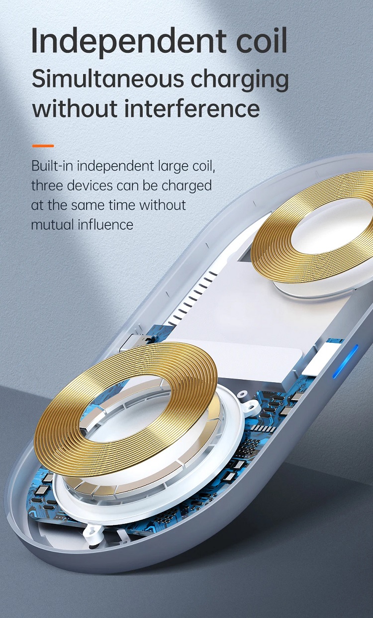 Incarcatorul Trio Wireless Charging Pad pentru telefon / TWS / Apple Watch de la Mcdodo accepta incarcare rapida cu pana la 15 W de putere maxima si accepta MagSafe. Drept urmare, incarcarea va dura doar cateva momente! In plus, veti fi informat despre starea de functionare a incarcatorului prin indicatorul luminos incorporat.