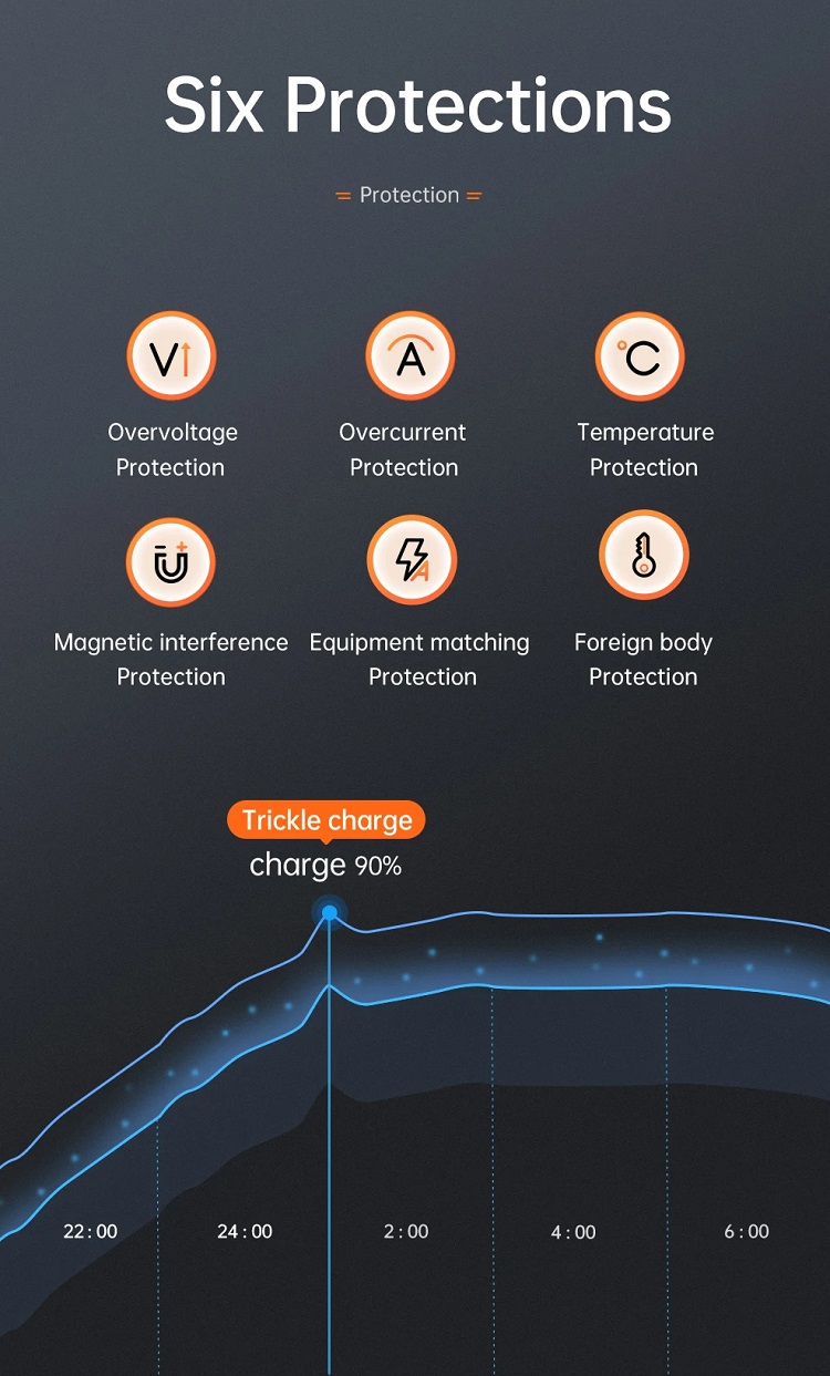 Echipat cu protectie pe 6 niveluri, incarcatorul ofera o protectie eficienta impotriva deteriorarii. Dispozitivul conectat este protejat impotriva supracurentului, supratensiunii, supraincalzirii sau interferentelor magnetice, printre altele. In plus, atunci cand nivelul de incarcare atinge un anumit nivel, incarcatorul va incetini incarcarea pentru a evita supraincalzirea sau deteriorarea bateriei.