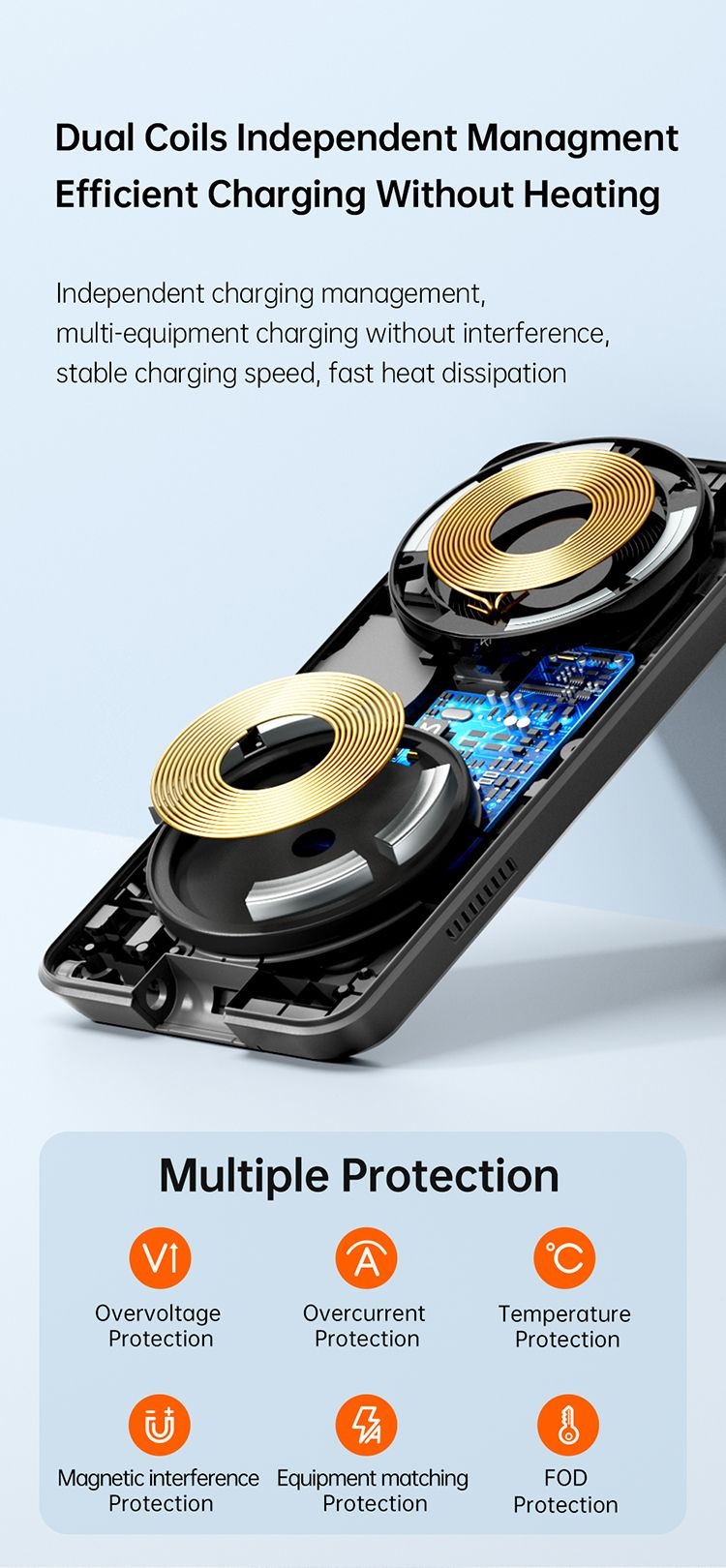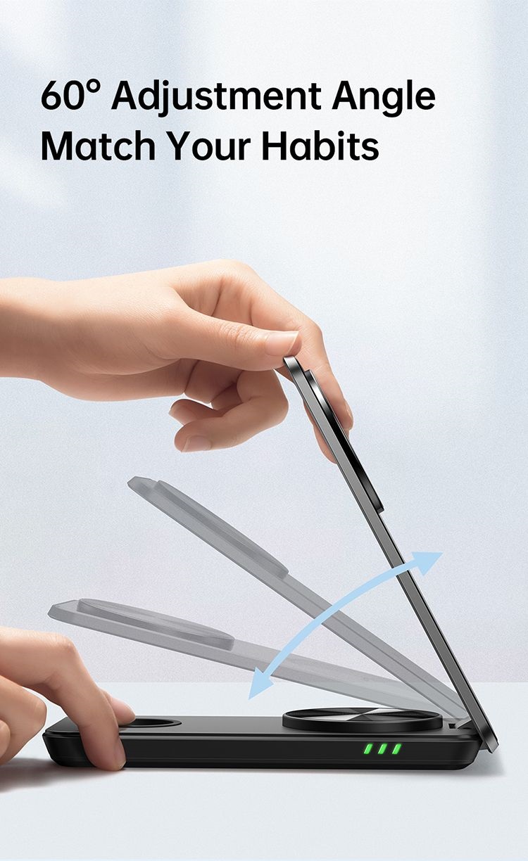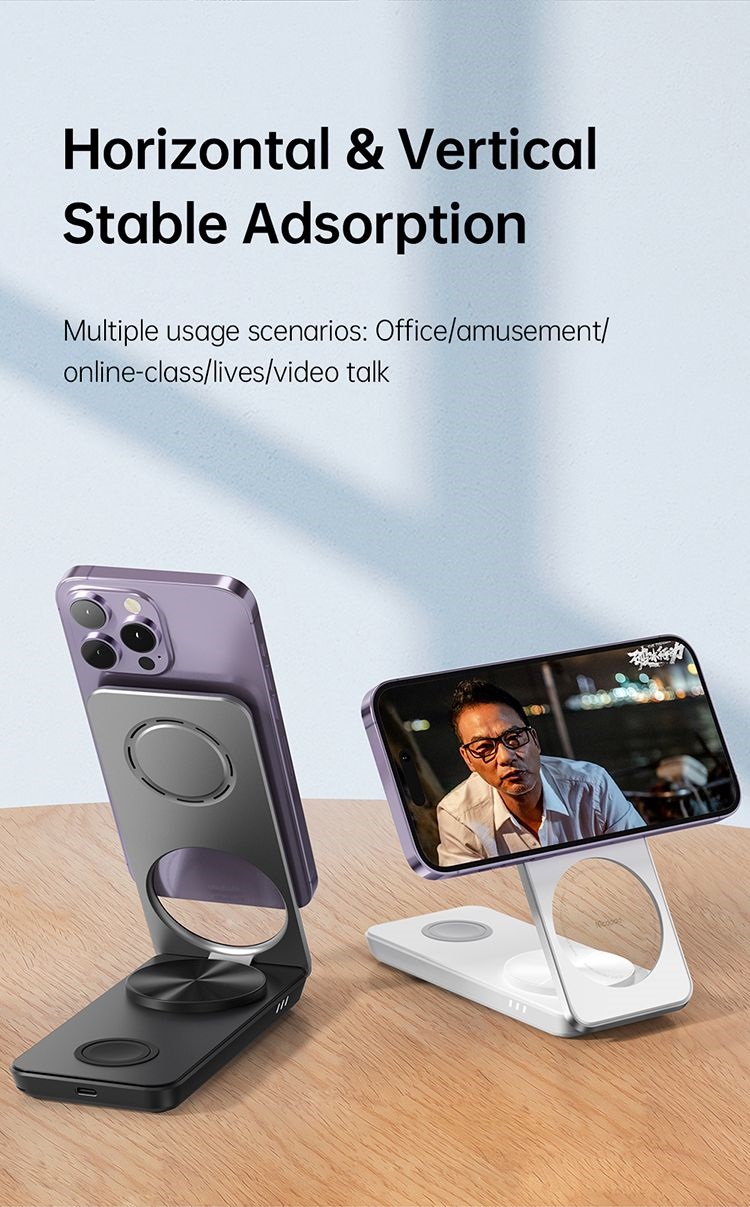 Accepta incarcare rapida fara fir de pana la 15 W si accepta o putere de incarcare wireless de 10 W / 7,5 W / 5 W.Puterea maxima de iesire la incarcarea a 3 dispozitive simultan: a unui smartphone, casti si ceas, fiecare putere de iesire corespunzatoare este de 15W + 5W + 5W.