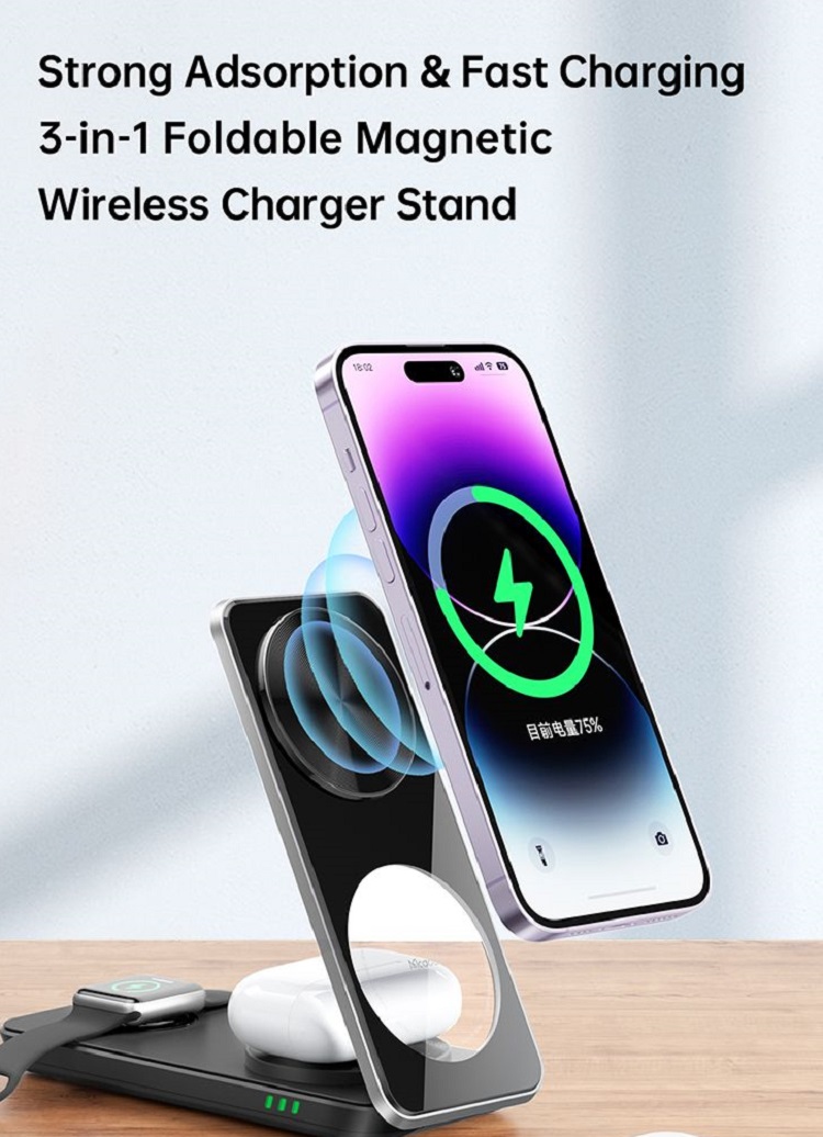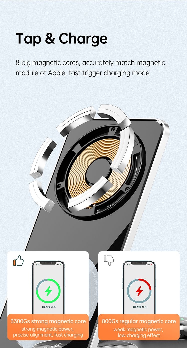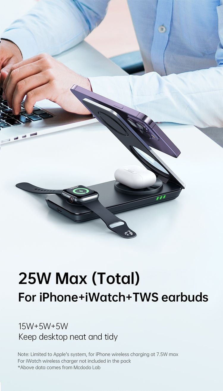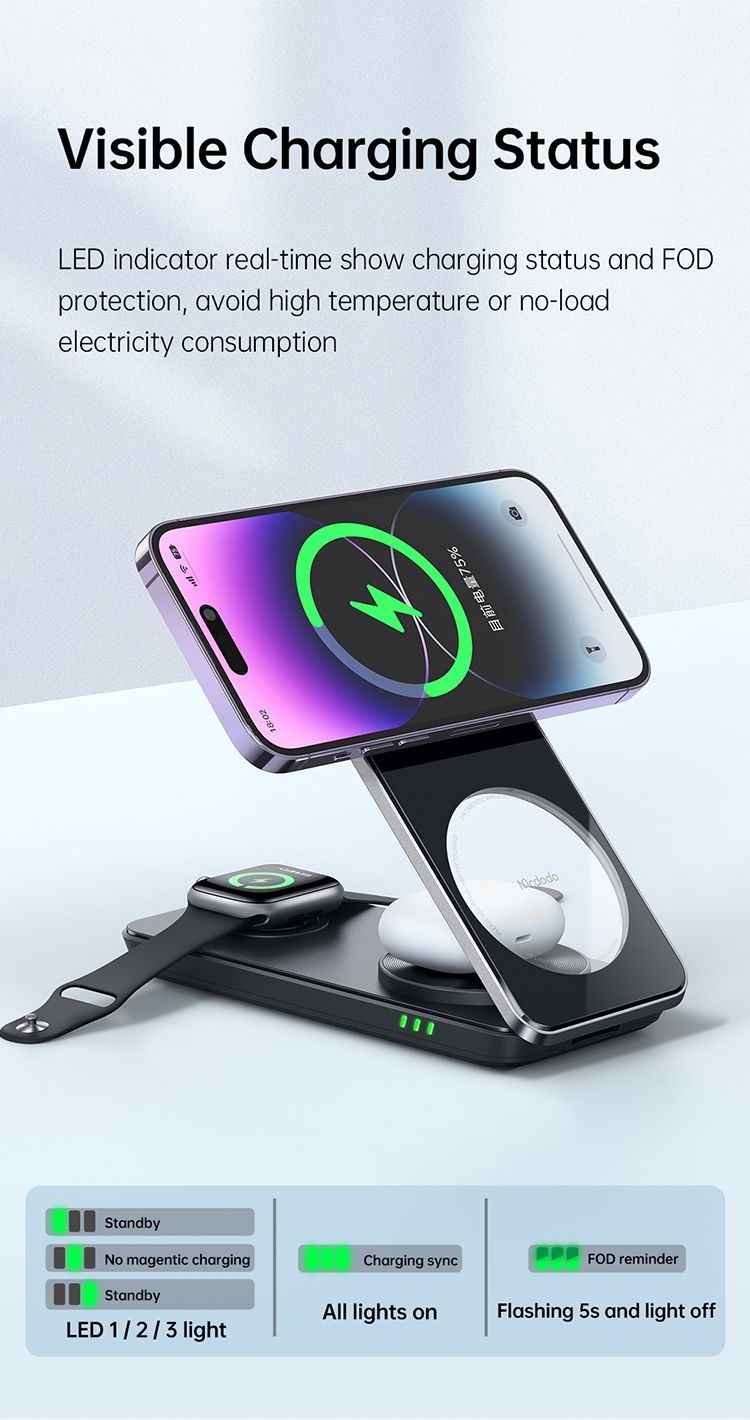 Incarcatorul Wireless Foldable 3in 1 Mangetic, pentru telefon / TWS / Apple Watch de la Mcdodo fabricat din miez de polietilena de inalta rezistenta de 3300 Gs pentru o aspiratie puternica si o aliniere precisa,incarca simultan smartphone-ul, castile si ceasul. Pliabil si usor de transportat, nu este compatibil doar cu iPhone, ci si cu modele wireless precum iWatch, AirPods, Galaxy, Xperia, Android etc.