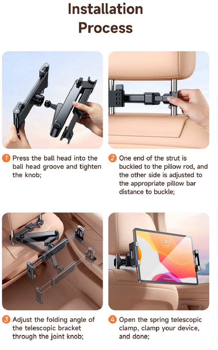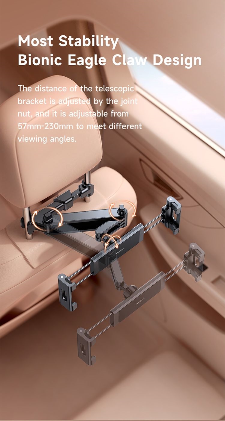 nu este doar functional si practic, ci si extrem de confortabil de utilizat. Datorita designului sau stabil cu bretele din aliaj de aluminiu, garanteaza instalarea directa si usoara fara a scoate tetiera. Designul unic al suportului telescopic va permite sa reglati distanta de la 57 mm la 230 mm, ceea ce va permite sa reglati unghiul de vizualizare la nevoile individuale. Un avantaj suplimentar este capacitatea de a roti suportul la 360 de grade, ceea ce sporeste semnificativ confortul utilizarii.