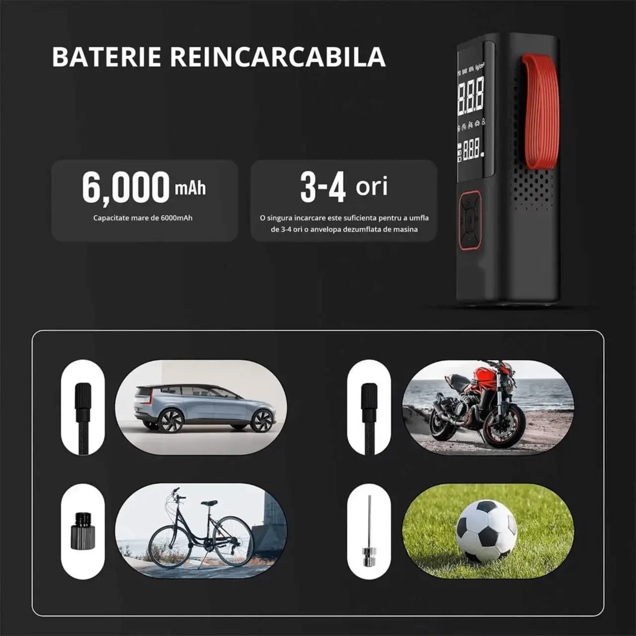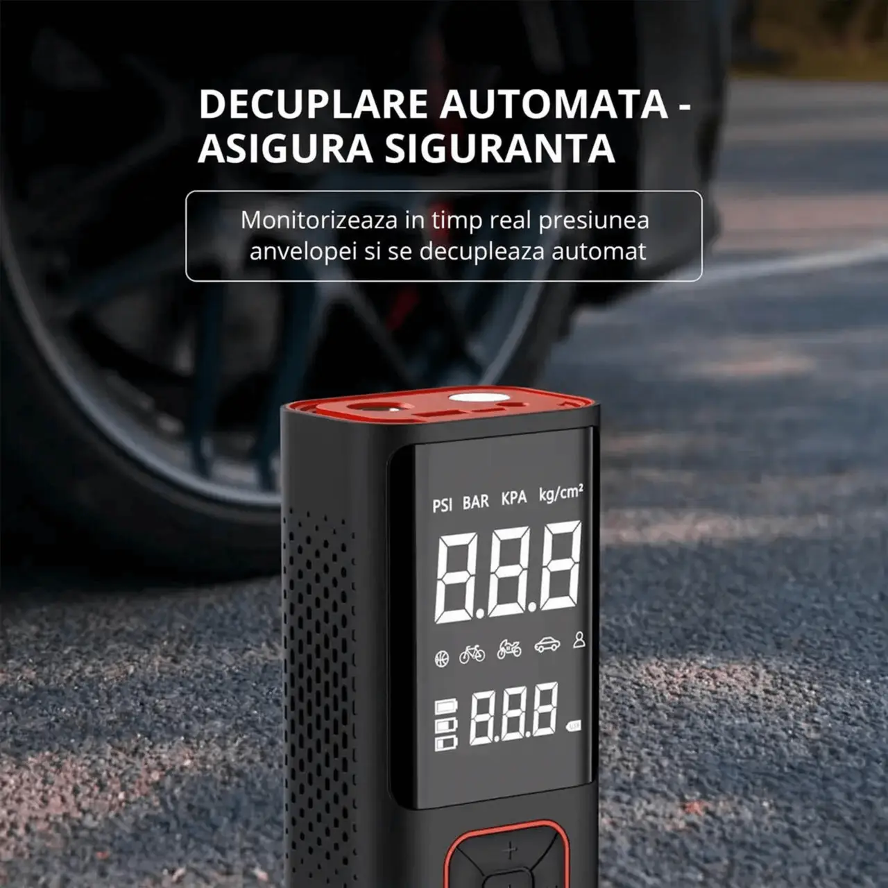 Functie 3 in 1: acest dispozitiv multifunctional serveste ca un compresor de aer, powerbank si lanterna LED, oferind o solutie completa pentru diverse necesitati de umflare si alimentare.