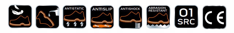 - Clasa protectie: O1 (incaltaminte cu talpa antiderapanta, antistatica, zona de acoperire a calcaiului inchisa, absorbtie soc in zona calcaiului)