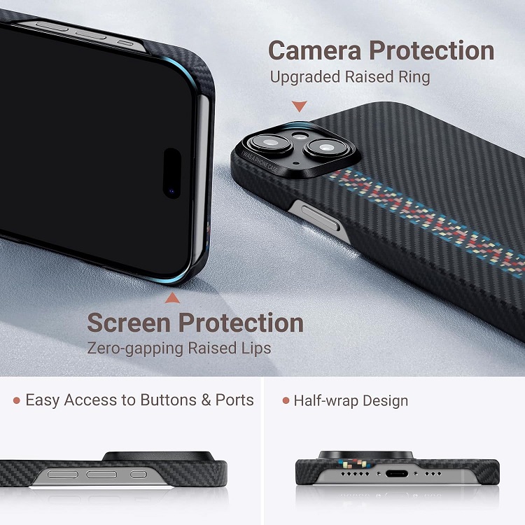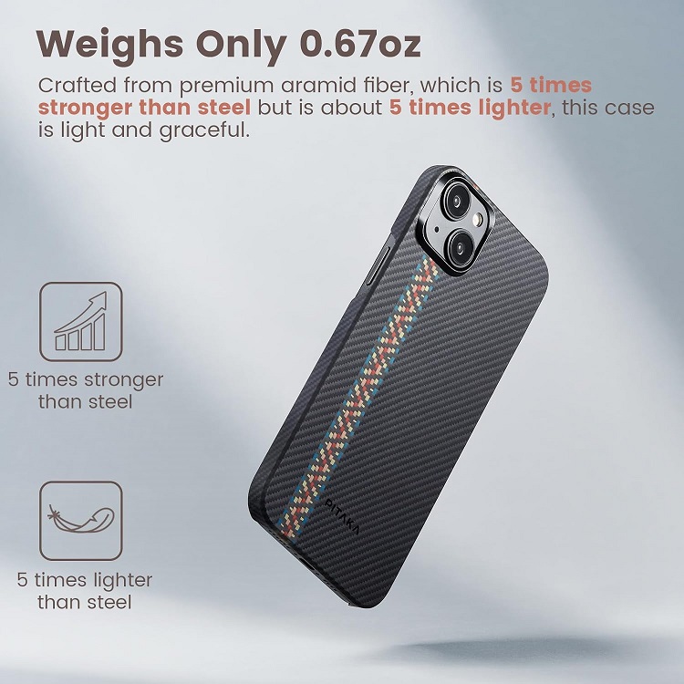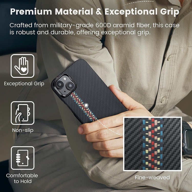 Husa MagEZ 4 Aramida 600D de la Pitaka pentru iPhone 15 Plus, este realizata din materile durabile ce protejeaza telefonul dumneavoastra impotriva uzurii cauzate de folosirea zilnica, a fost proiectata pentru o compatibilitate totala cu accesoriile MagSafe asigurand o prindere ferma si sigura.