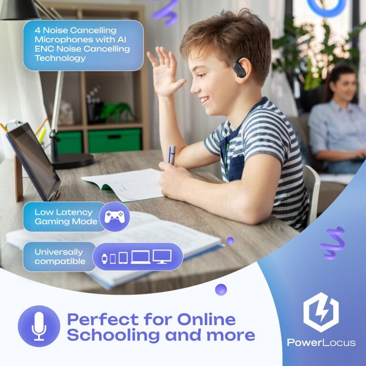 Castile pentru copii, Wireless Open-Ear Jumpy de la PowerLocus, cu un design inovator cu ureche deschisa, aceste casti usoare ofera o potrivire sigura si confortabila, permitand copiilor sa se bucure de muzica, cartile audio si apelurile lor preferate in timp ce raman la curent cu imprejurimile lor. Fie acasa, in sala de clasa sau in deplasare, Jumpy ofera o experienta audio captivanta, fara a compromite siguranta.