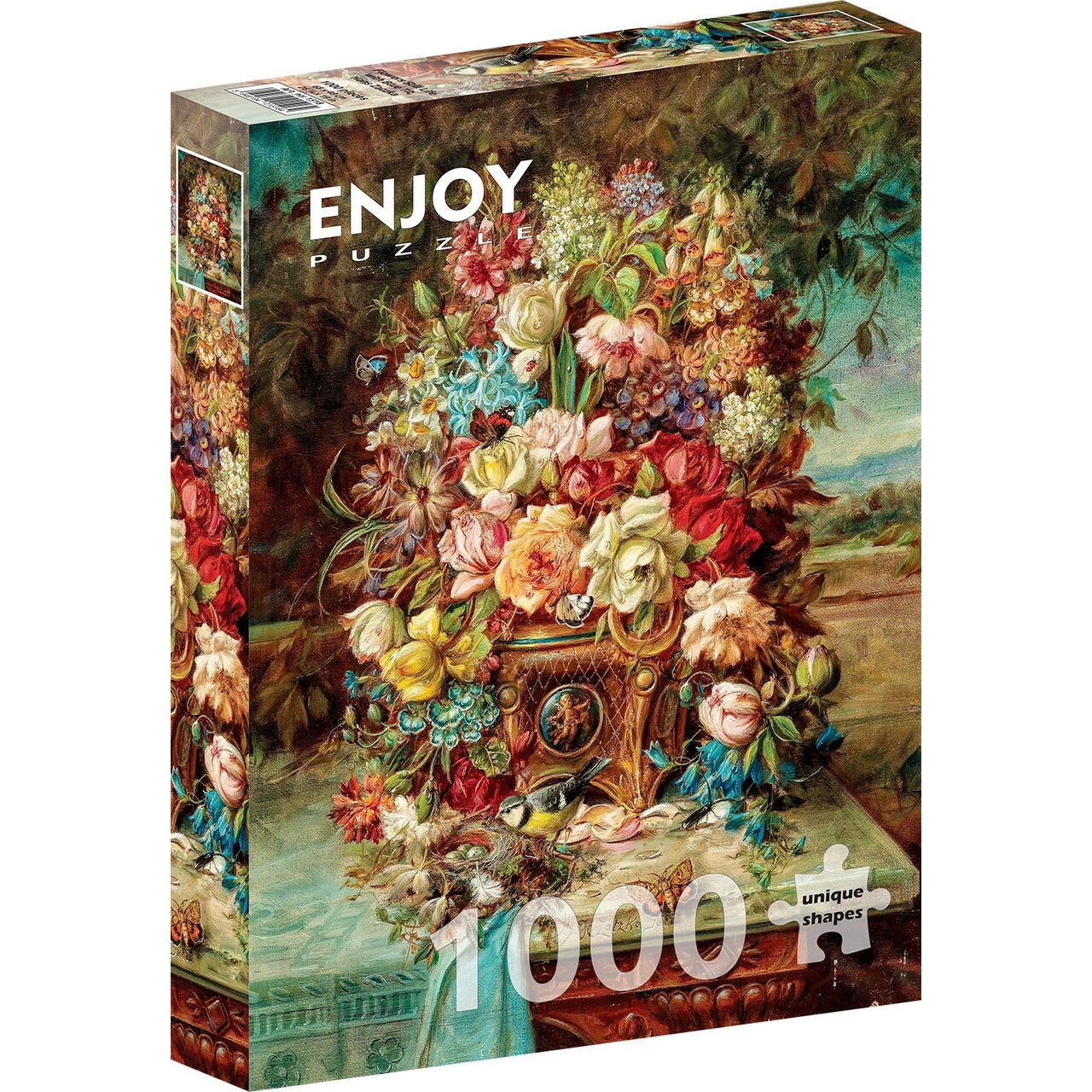 Puzzle 1000 piese Enjoy - Hans Zatzka: Flowers Still Life with Blue Tit