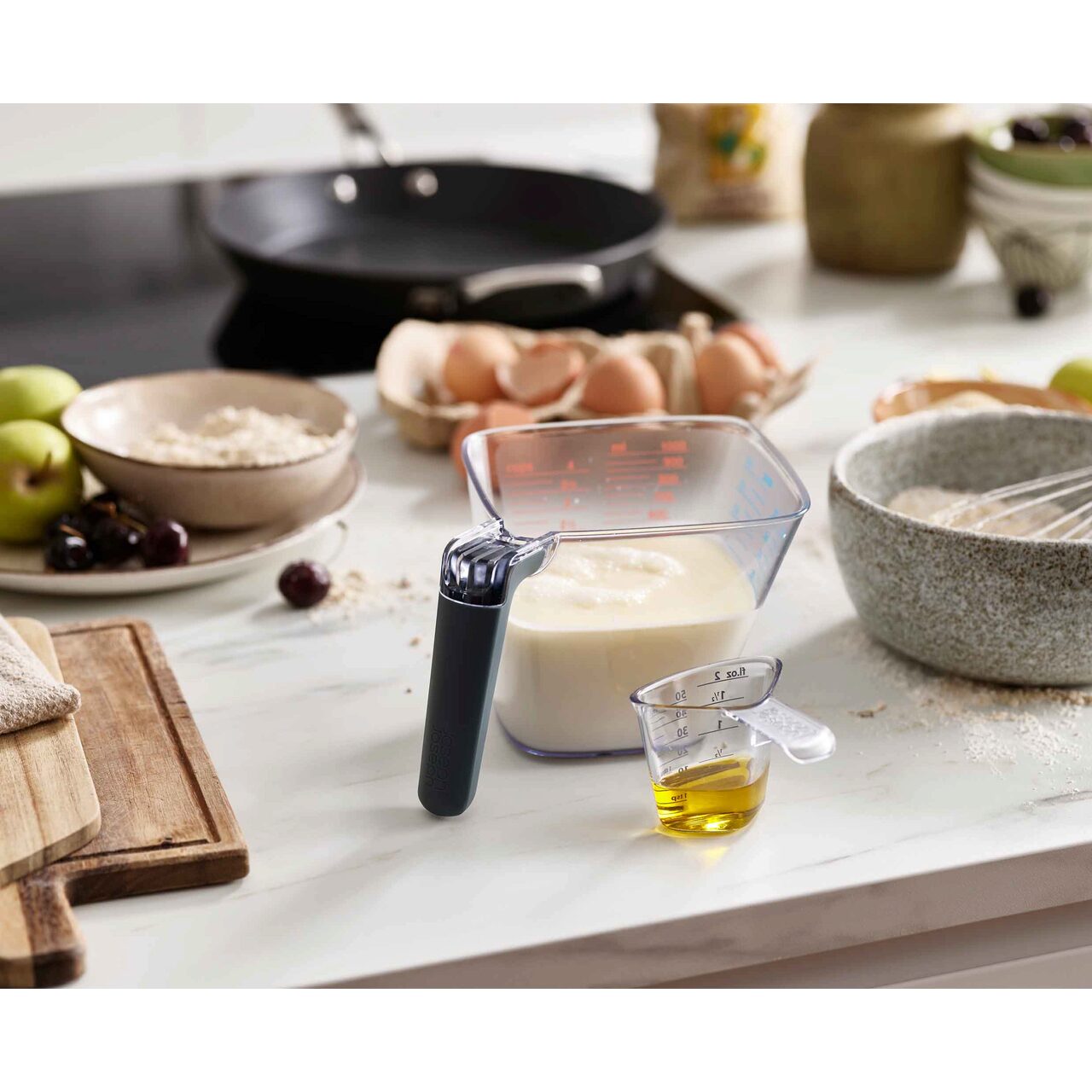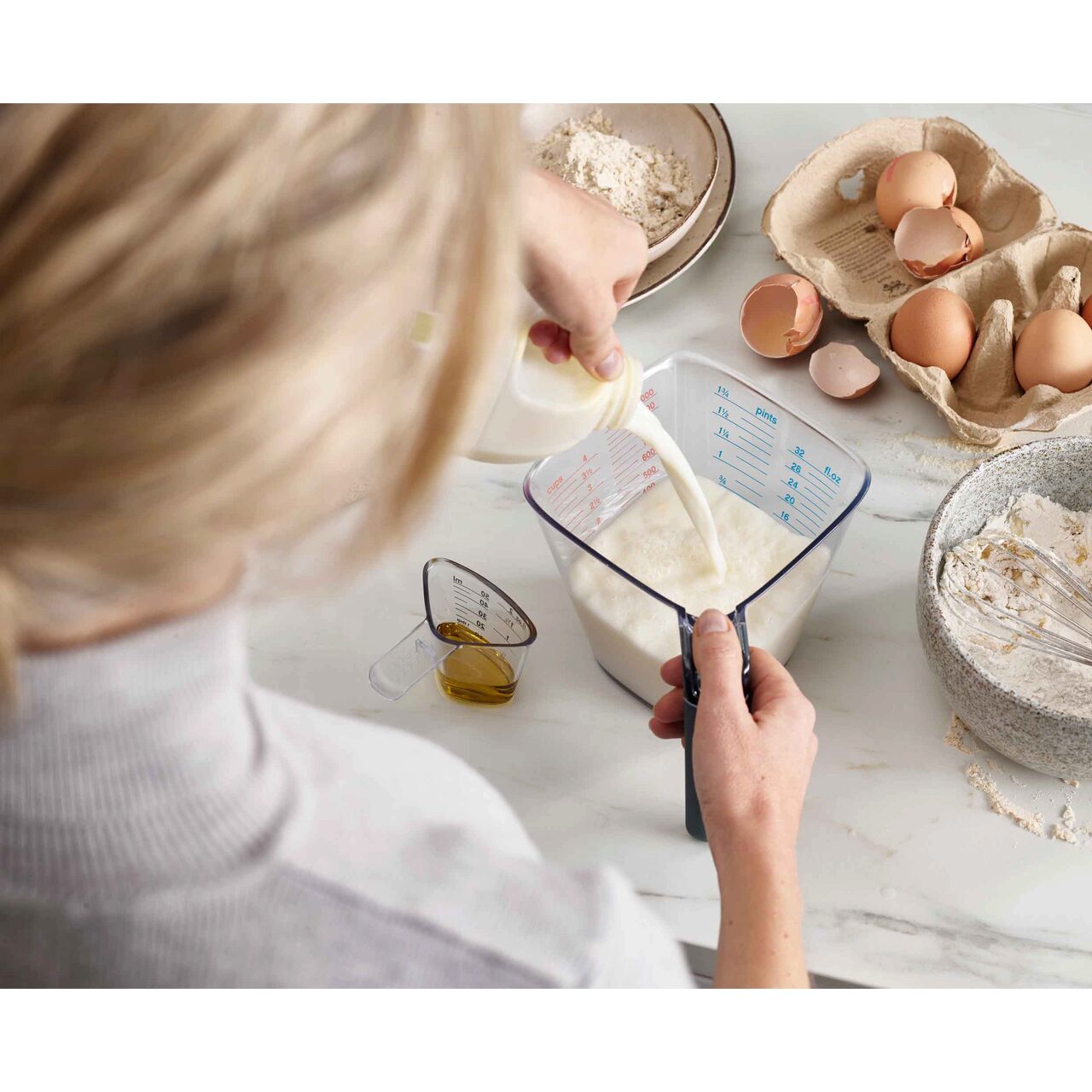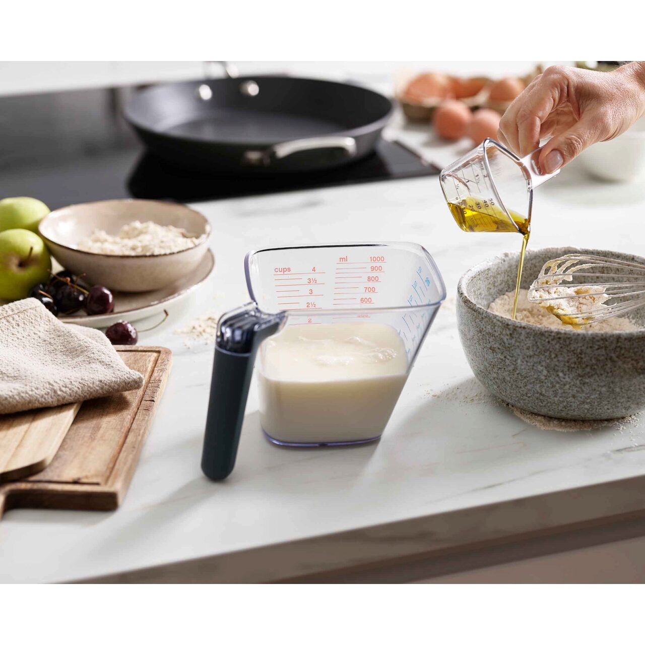 Această cană de măsurat mare are un design înclinat cu măsurători clare, astfel încât să nu mai fie nevoie să te apleci pentru a citi volumul, ci poți citi de sus în timp ce torni lichidul.