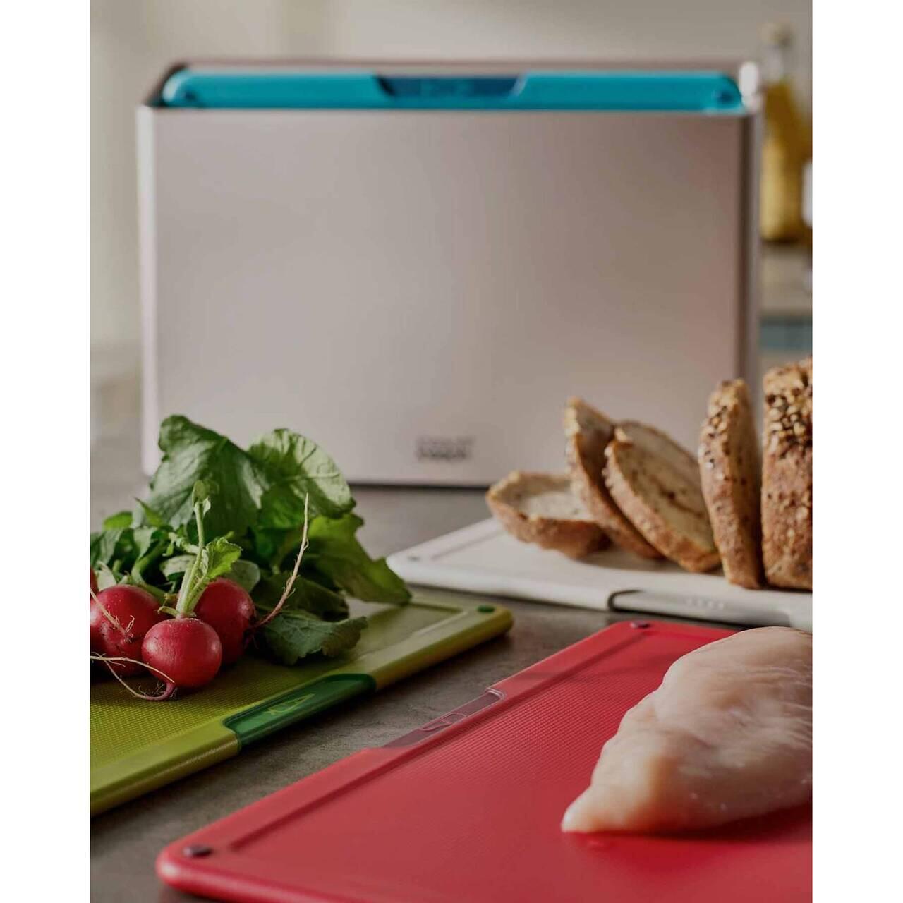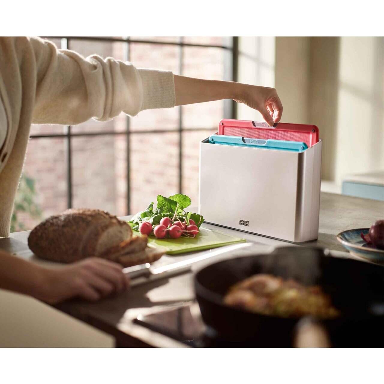 - Set de 4 planșe de tocat antiderapante, specifice pentru alimente, plus o cutie de depozitare slimline