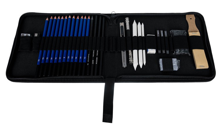 - Contine o selectie bogata si completa de instrumente destinate desenului in creion sau conceperii schitelor/portretelor. Setul contine: 12 creioane (2H, 3H, 4H, 5H, HB, B, B2, B3, B4, B5, B6, B8), un creion grafit (6B), 3 creioane cu carbune (moale, mediu si dur), un cutter, un prelungitor pentru creion, doua ascutitori, 3 lame de ascutire, radiera pentru creion, radiera pentru grafit, 3 bucati de carbune (moale, mediu si dur), 3 bucati de grafit (moale, mediu si dur), o paleta de smirghel si un penar.