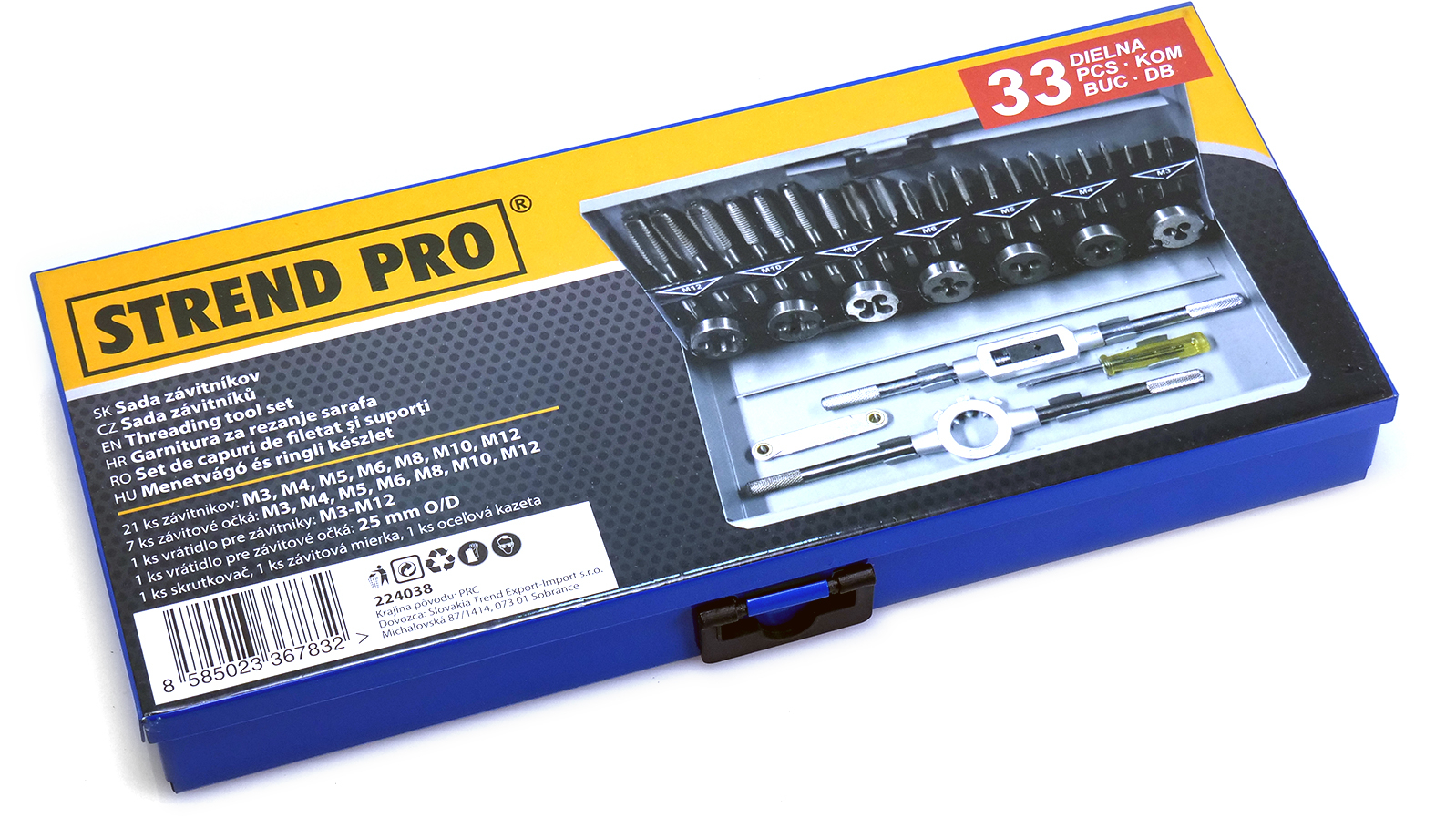 - Continutul trusei este dotat cu manere port tarod si port filiera, filiere M3, M4, M5, M6, M8, M10, M12, tarozi la set de 3 buc M3, M4, M5, M6, M8, M10, M12.