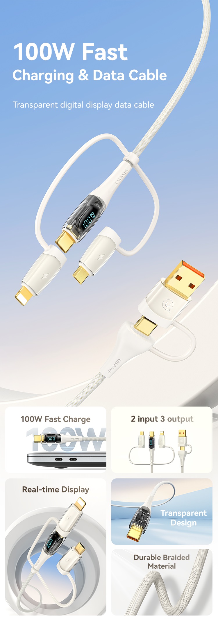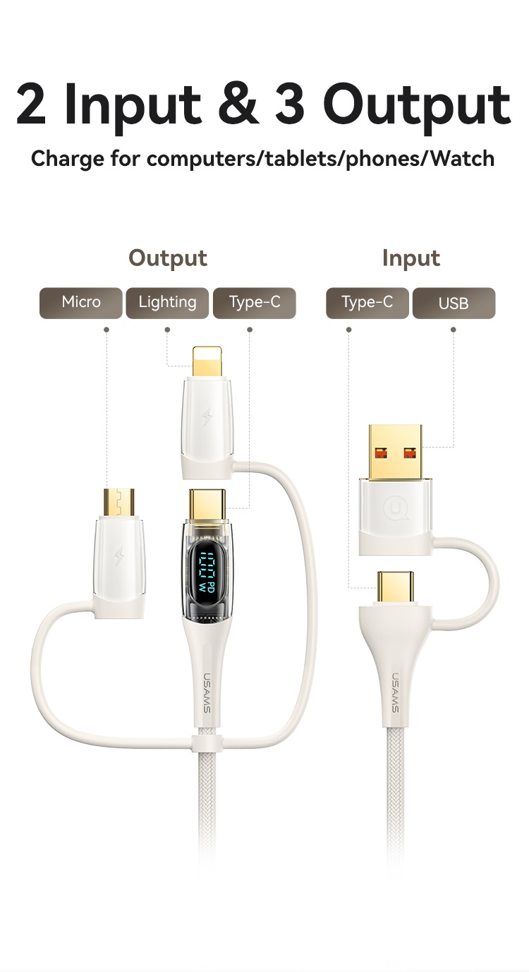 Usams Cablu Shadow Series 6in1, USB-A/Type-C la Type-C/Lightning/Micro, Fast Charging PD ,100W, 1.2m, Bej