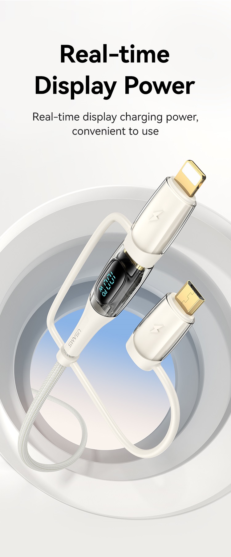 Ofera o afisarea vizibila a datelor privind puterea de incarcare in timpul incarcarii prin acest timp de sincronizare digital a cablului.LED-urile incorporate indica atunci cand dispozitivul se incarca sau este complet incarcat.