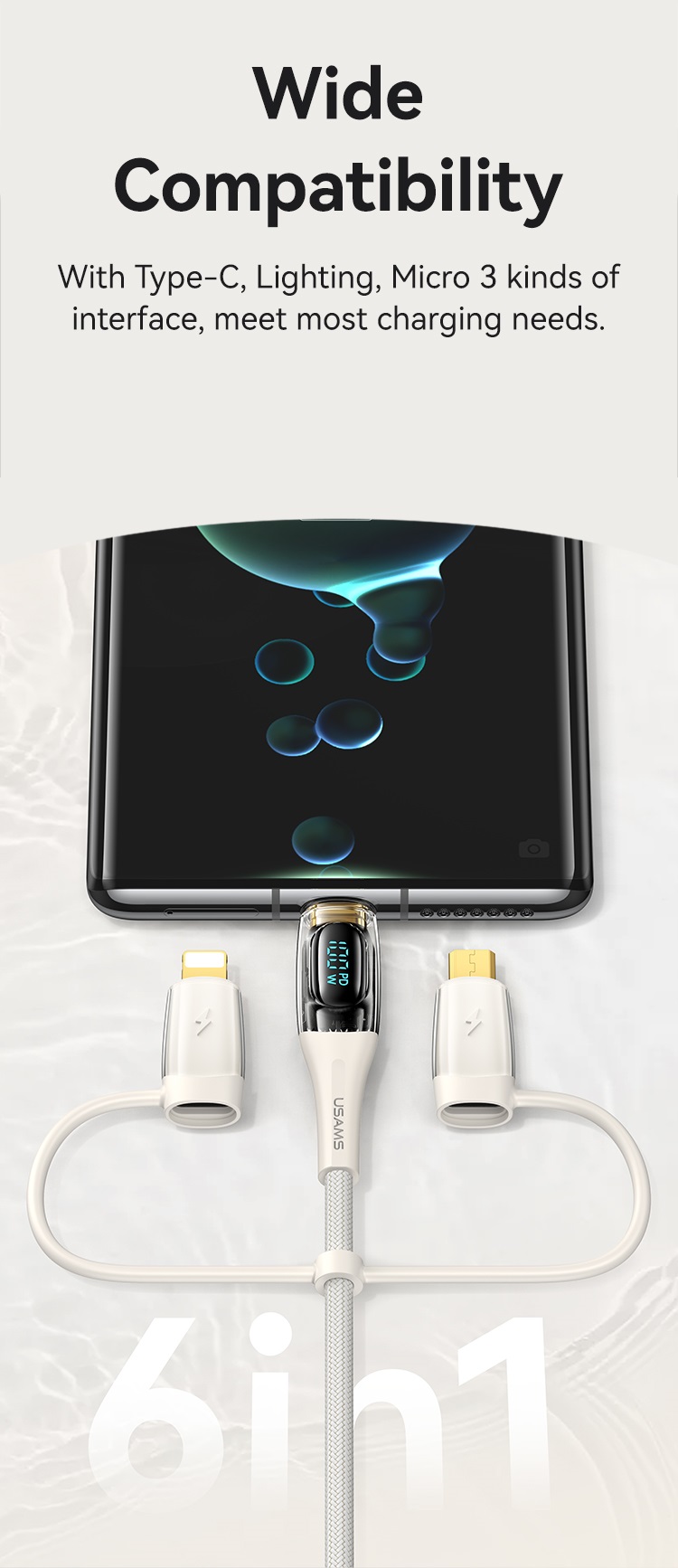 Cablul Shadow Series 6in1 de la Usams se poate utiliza pentru a incarca aproape toate modelele de dispozitive mobile, avand in componenta intrare dubla si trei iesiri, mufe cu principalii conectori aflati acum pe piata: MicroUSB, Lightning si Type-C.
