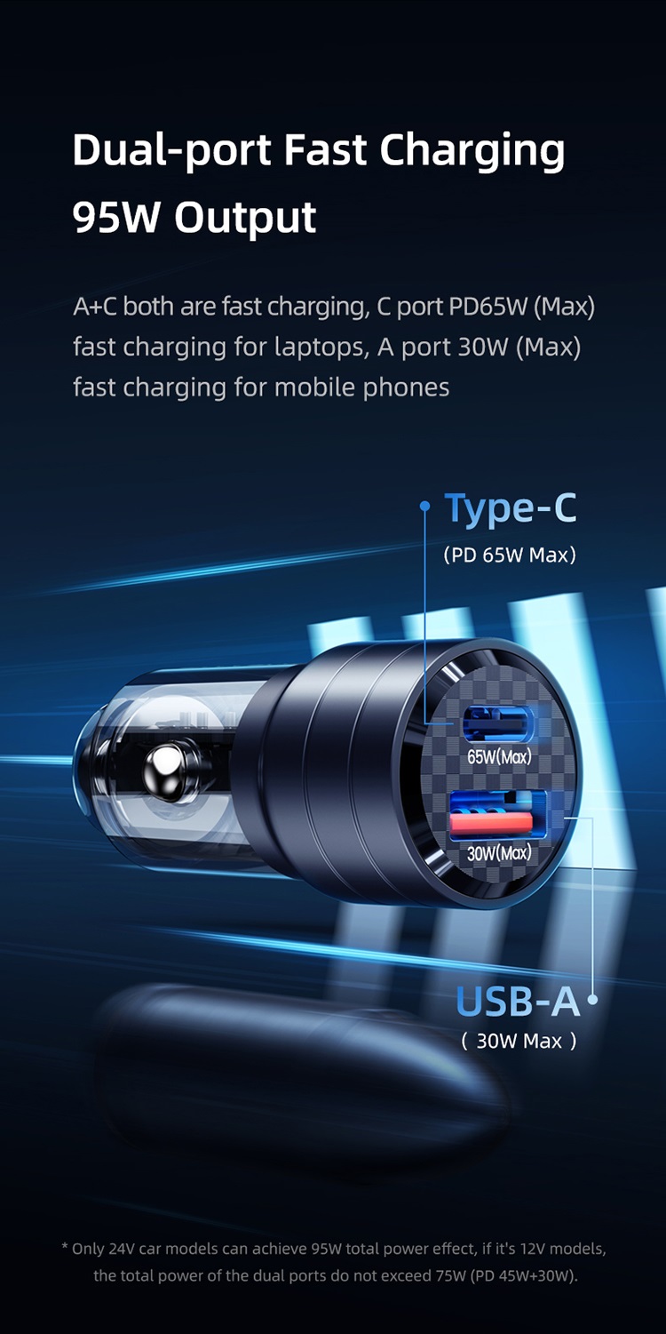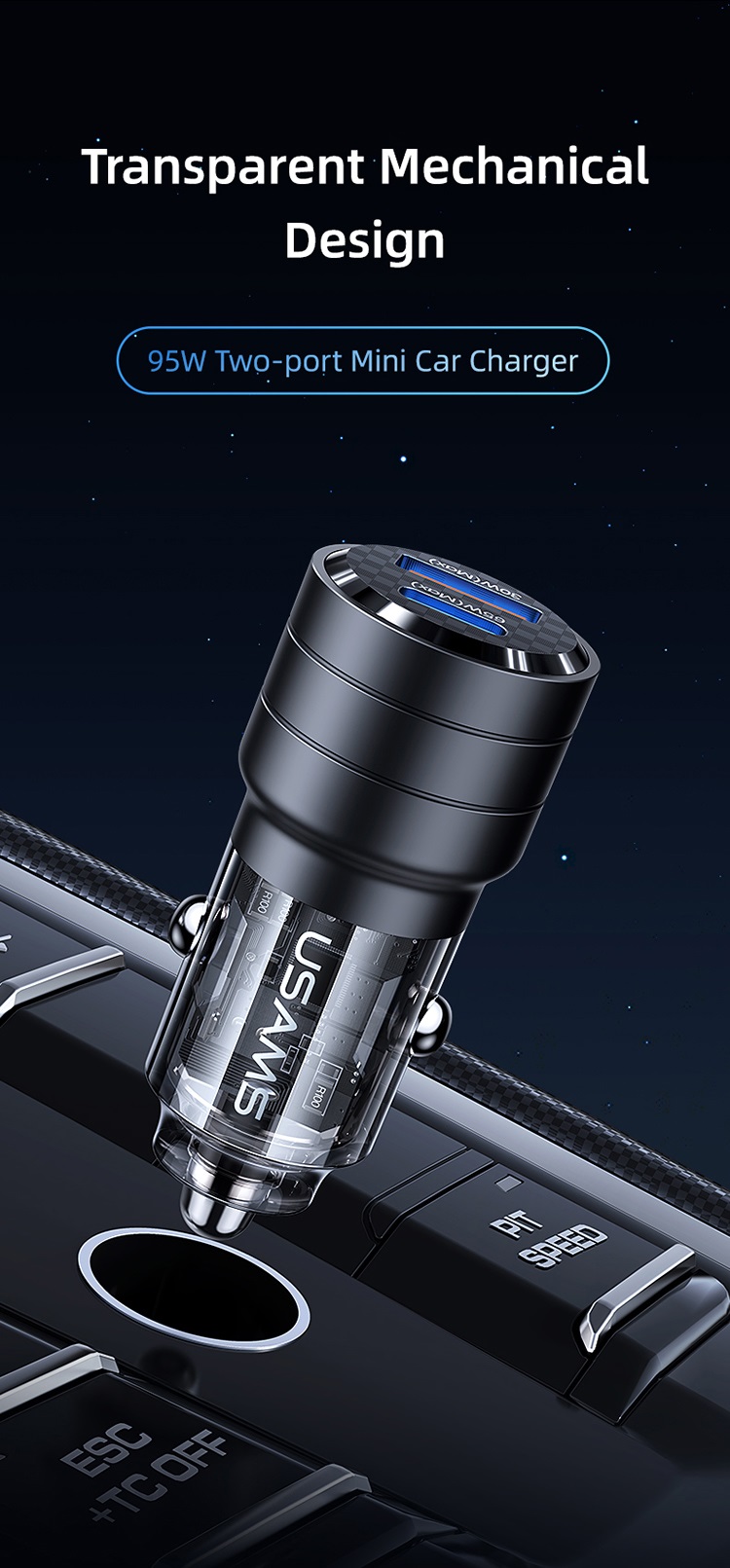 Incarcatorul Auto Mini US-CC176 Dual port USB si Type-C, Fast Charge, 95W de la Usams, are un strat transparent care sigileaza perimetrul, permitand in acelasi timp afisarea clara si vizuala a componentelor interne si precise. Acest lucru permite utilizatorului sa vada cum functioneaza dispozitivul in timp real, ceea ce adauga un element interesant si inovator experientei de incarcare.