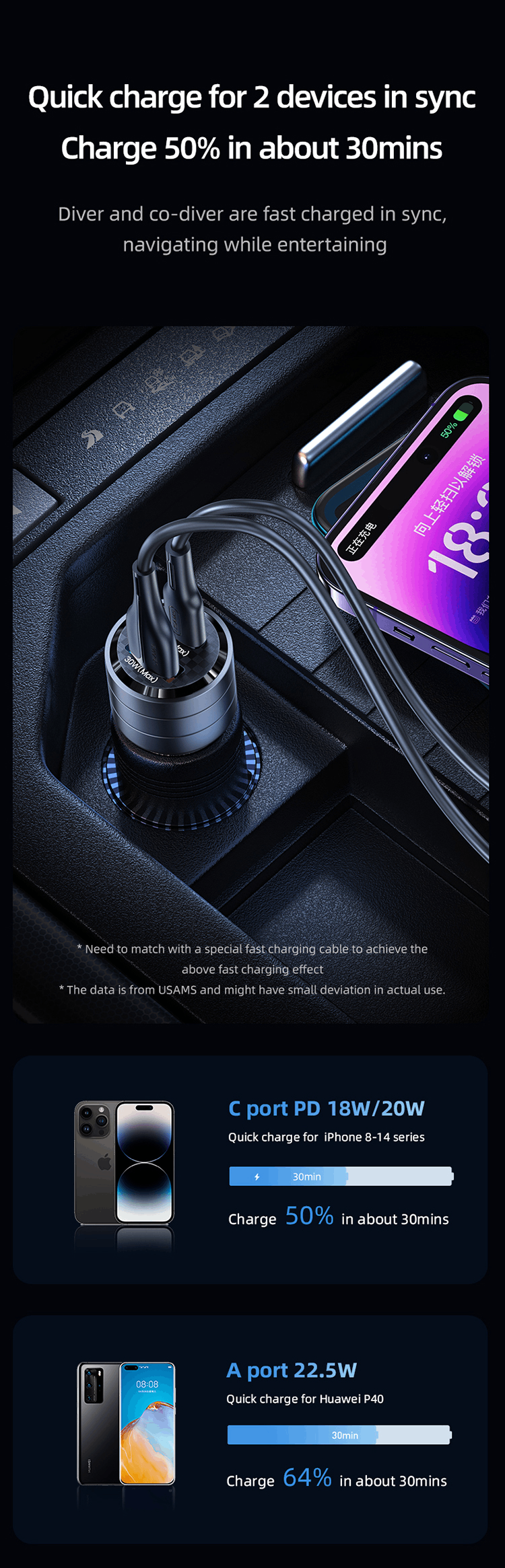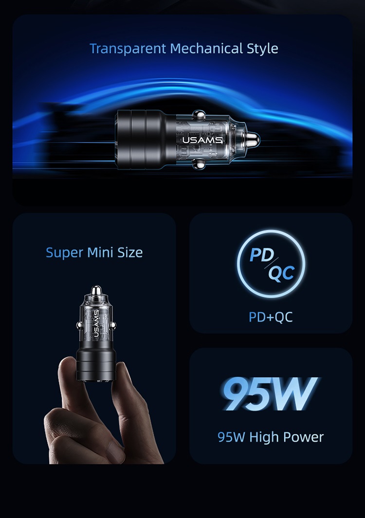 Usams Incarcator Auto Mini US-CC176 Dual port USB si Type-C, Fast Charge, 95W, Transparent / Negru