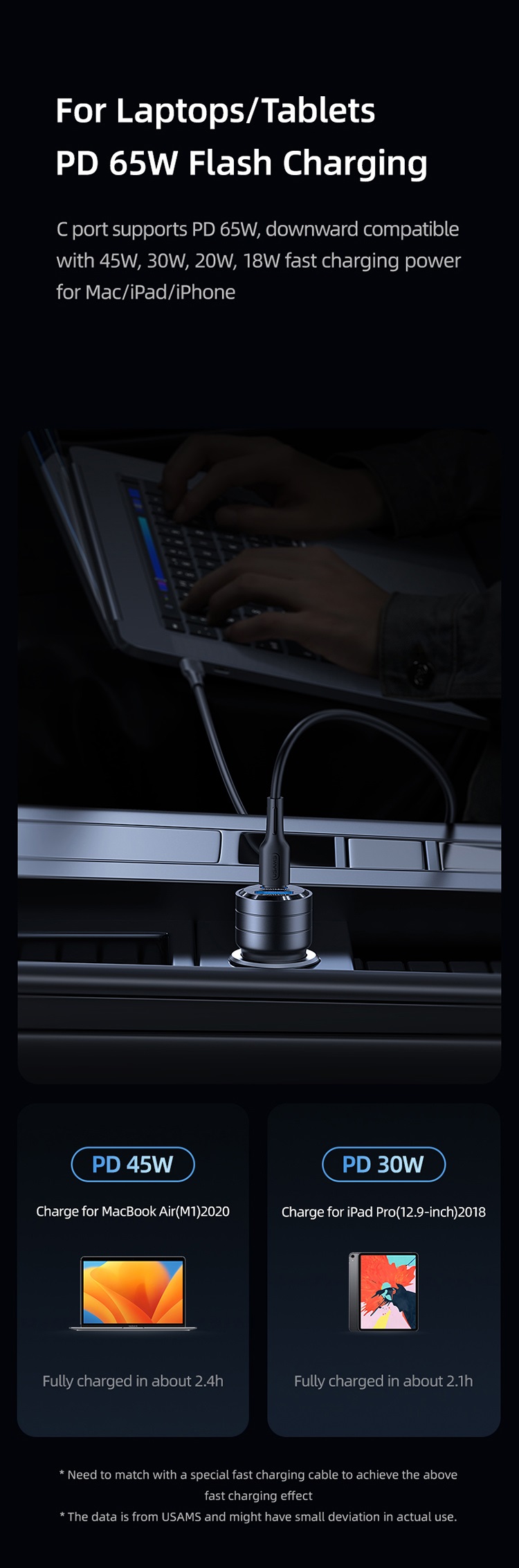 Incarcatorul are doua porturi cu o putere totala de iesire de 95 W. Ambele porturi, A si C, sunt echipate cu incarcare rapida. Portul USB-C, cu o putere maxima de iesire de 65W, este proiectat pentru incarcarea rapida a laptopurilor, in timp ce portul A, cu o putere maxima de iesire de 30W, este utilizat pentru incarcarea rapida a telefoanelor.