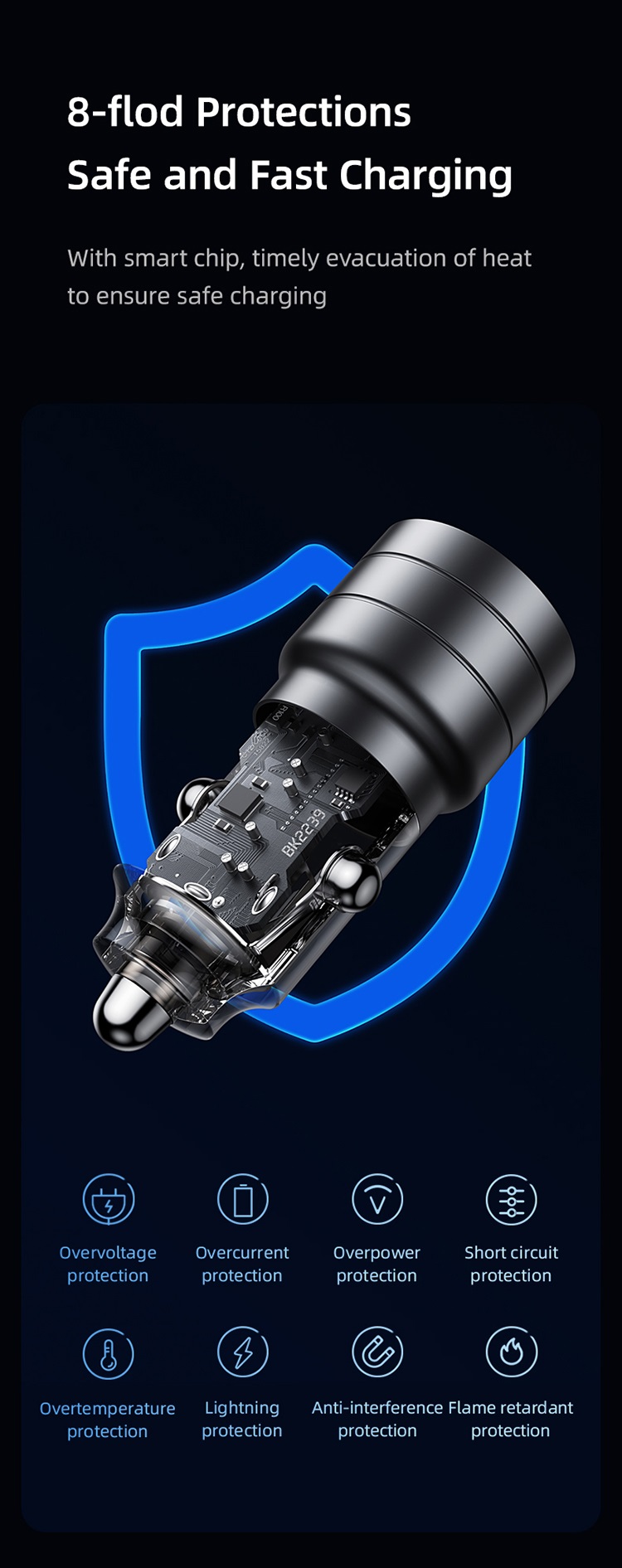 Cu un cip inteligent care disipeaza caldura, acest dispozitiv asigura incarcarea sigura. Sistemul incorporat asigura controlul temperaturii dispozitivului incarcat, ceea ce il protejeaza de supraincalzire si asigura o durata de viata mai lunga. In plus, utilizatorul isi poate incarca dispozitivele fara sa-si faca griji ca i se va intampla ceva.