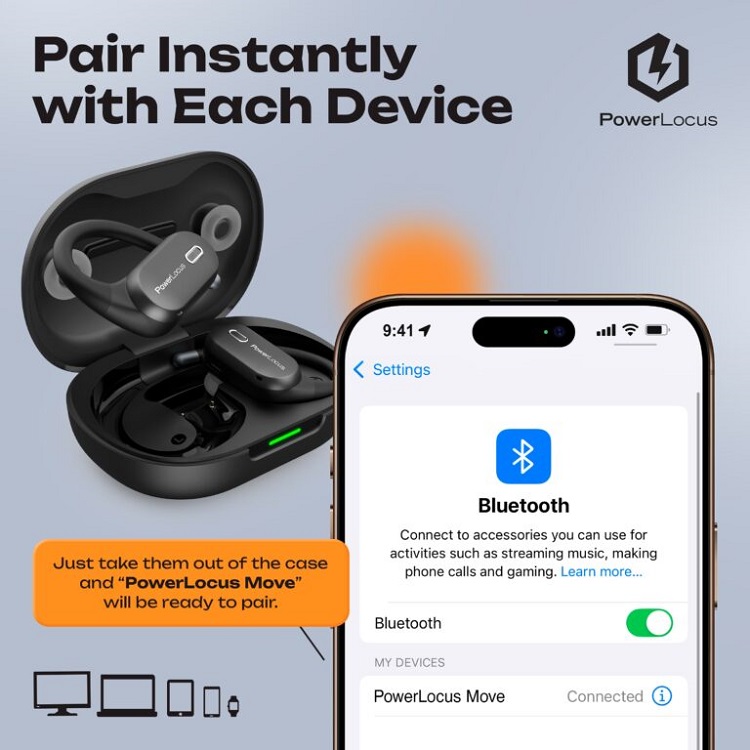 Experimenta un sonido potente y bien equilibrado con los PowerLocus Move. Diseñados con controladores avanzados, estos auriculares ofrecen agudos claros, graves profundos y medios nítidos, todo mientras mantienen tus oídos abiertos al mundo que te rodea. Ya sea que escuches música, podcasts o llamadas, disfruta de una experiencia de sonido premium sin perder la consciencia de tu entorno. ¡Perfectos para entrenar, ir al trabajo y tus aventuras diarias!