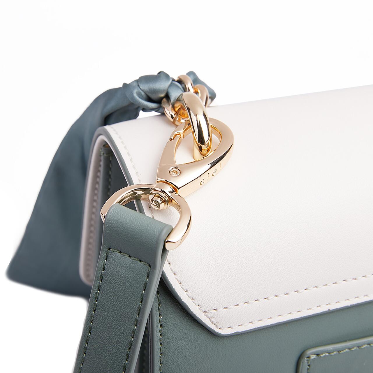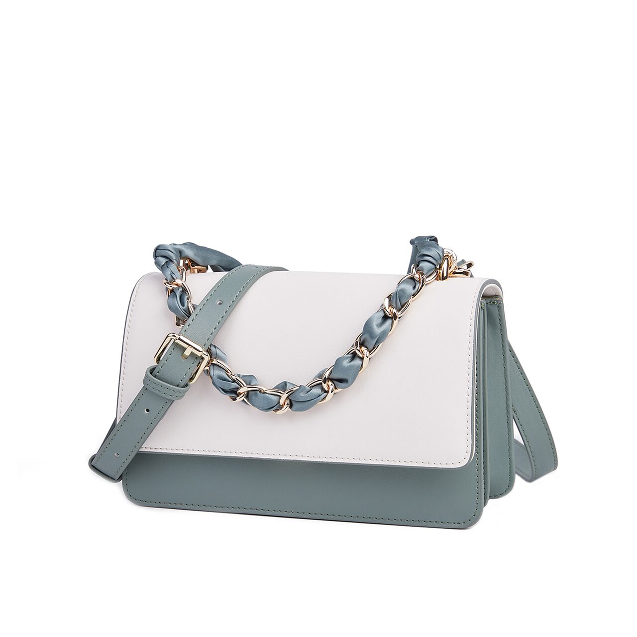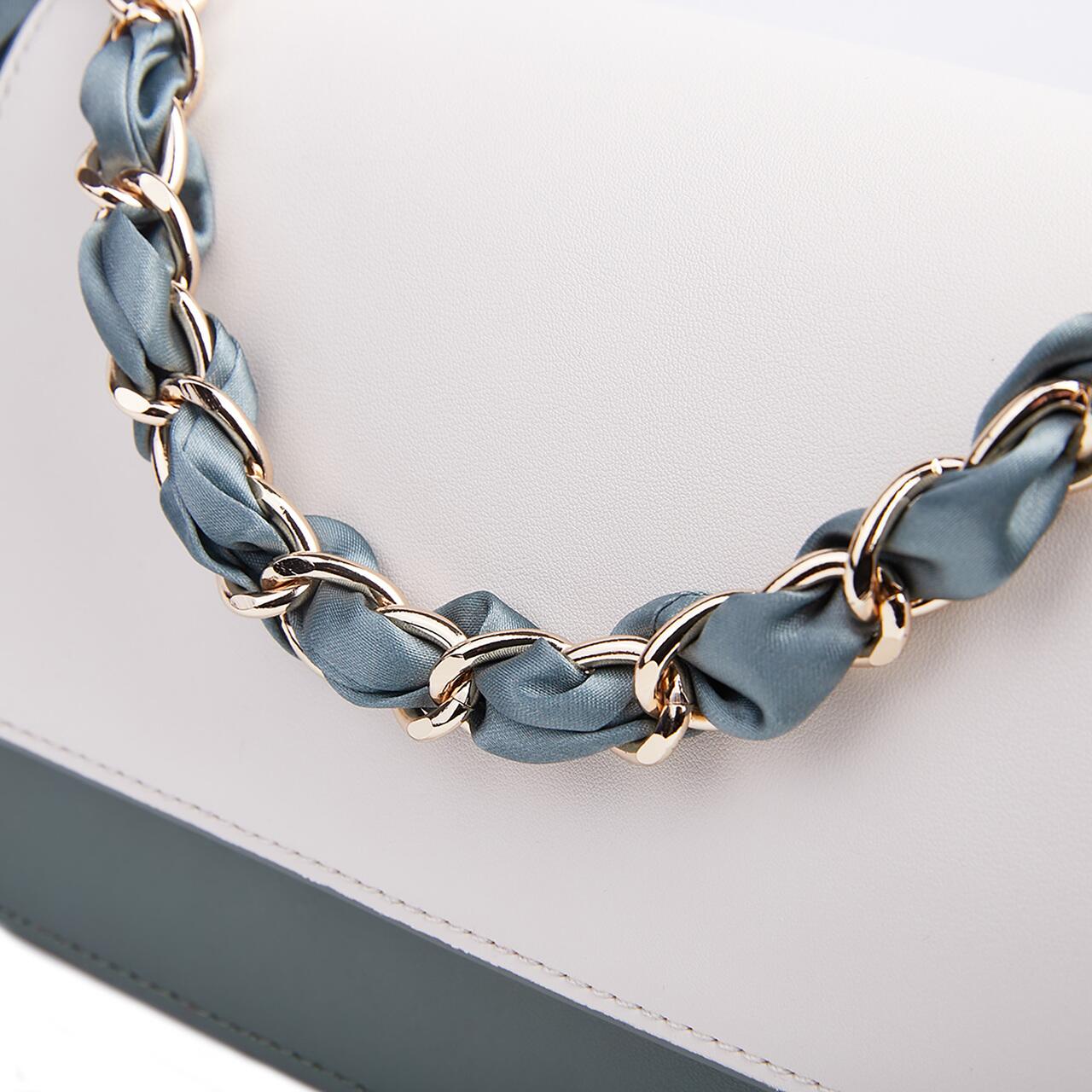 La cadena desmontable con inserto de satén le aporta un aire femenino y personal, y su silueta geométrica define el estilo, tanto al hombro como en la mano.