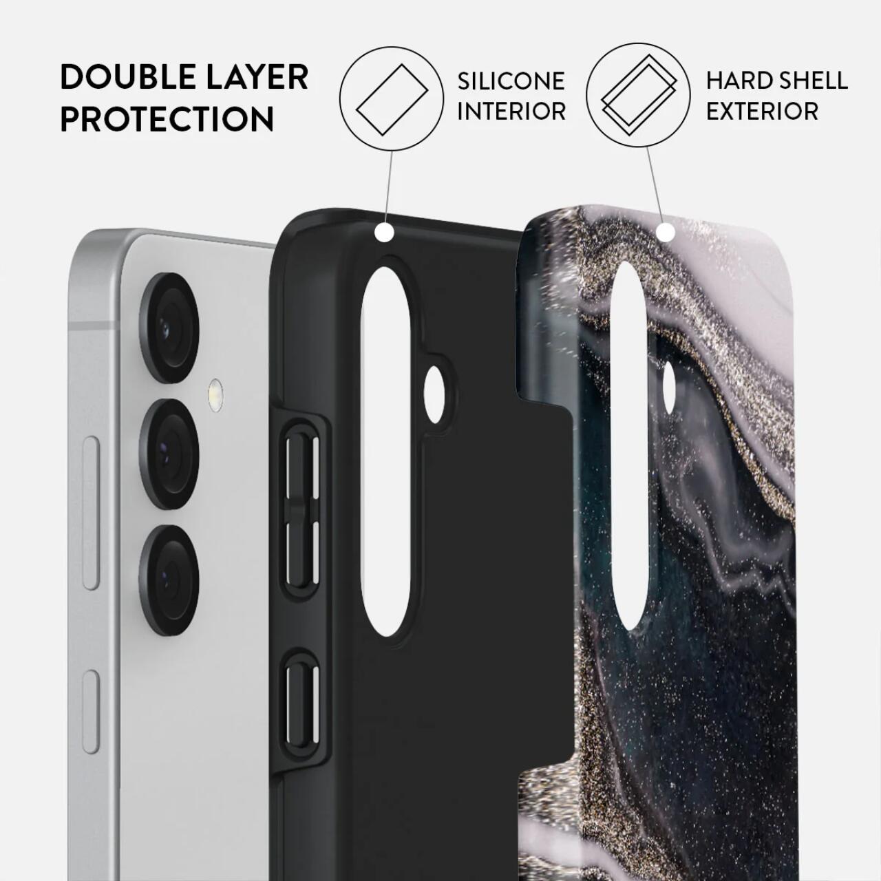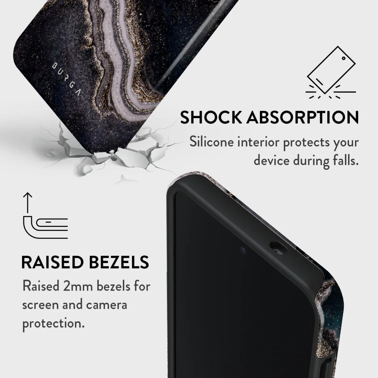 La funda Dual Layer Magic Night para Samsung Galaxy S25 de Burga tiene un patrón único y colorido, y el interior de silicona protegerá el dispositivo durante las caídas, mientras que los biseles elevados de 2 mm ofrecen protección para la pantalla y la cámara.