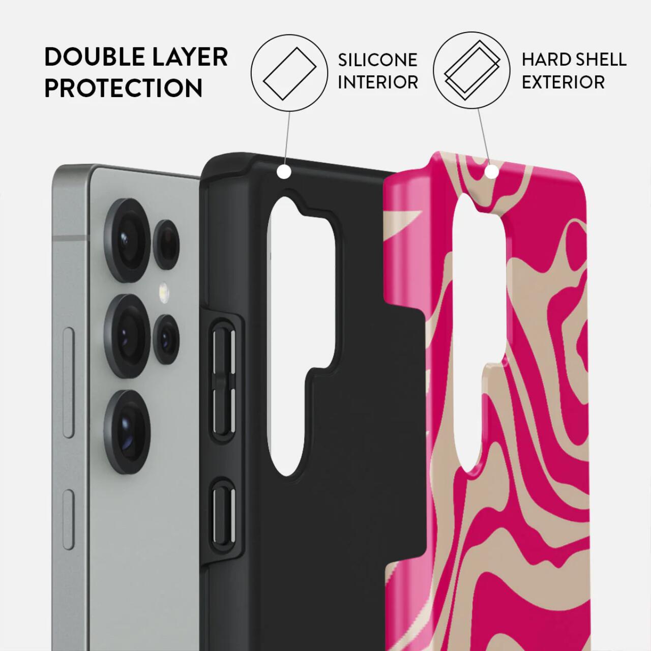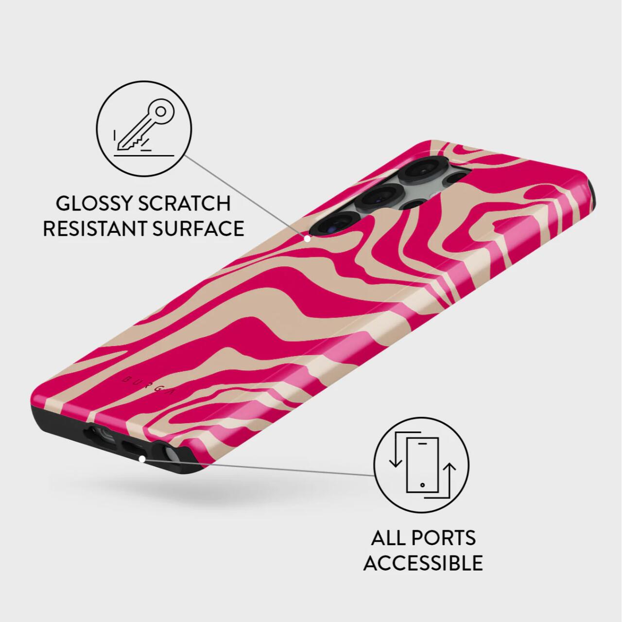 La funda Dual Layer Siren para Samsung Galaxy S25 Ultra de Burga tiene un patrón único y colorido, y el interior de silicona protegerá el dispositivo durante las caídas, mientras que los biseles elevados de 2 mm ofrecen protección para la pantalla y la cámara.