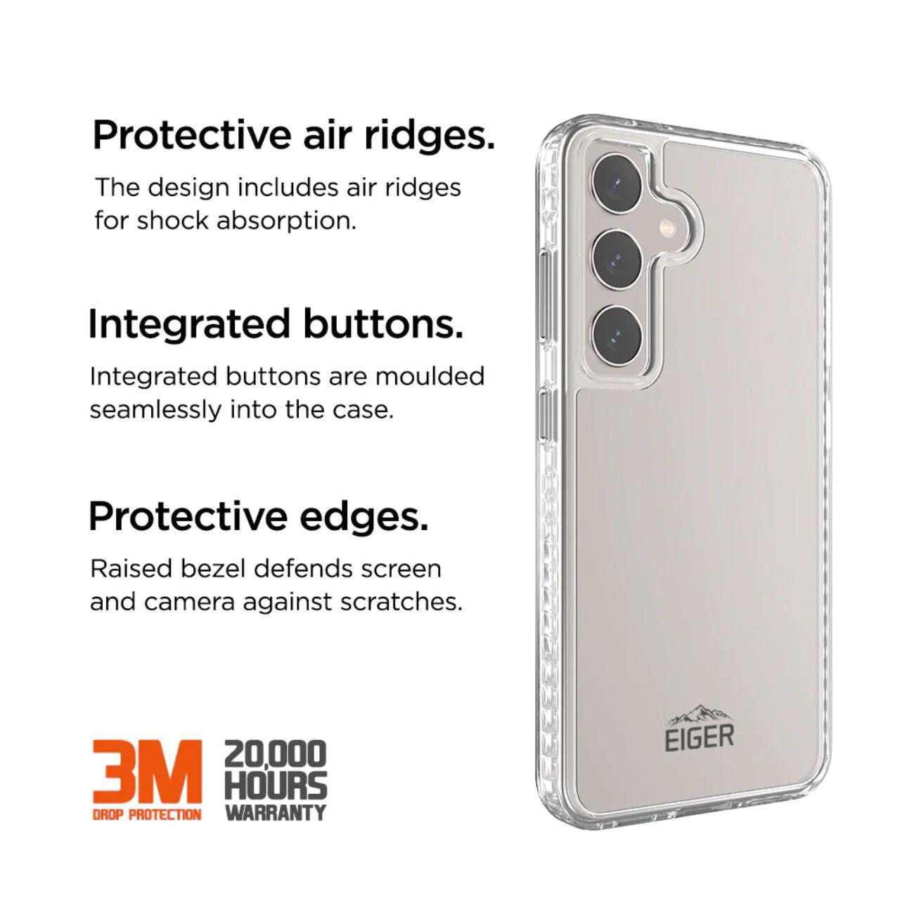 HusA PROPS para Samsung Galaxy S24 de Eiger, tiene hielo de diseño alpino para transparente Protección discreta. El único ICE TEC+ evita que el cadáver del teléfono sea amarillo por más tiempo y protege su dispositivo de rasguño. Junto con la tecnología integrada con los botones, este estuche muestra el dispositivo de estilo, al tiempo que proporciona protección diaria. Ft), y los bordes altos del marco lo ayudan a proteger su pantalla. Br />- Bordes flexibles