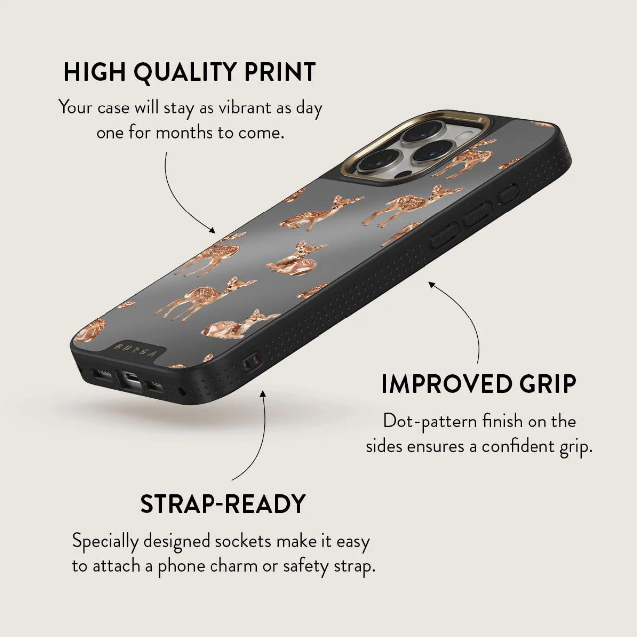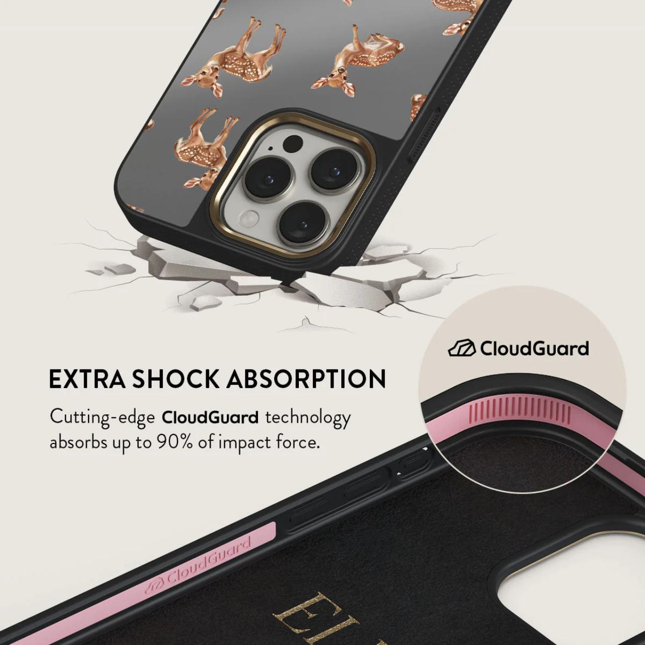 La funda Elite Mirror Magsafe Gold Bambi para iPhone 15 Pro Max de Burga, diseñada para absorber impactos y ofrecer protección, cuenta con la última tecnología CloudGuard y un elegante acabado efecto espejo. El interior de microfibra mantiene el teléfono cómodo y evita rayones.