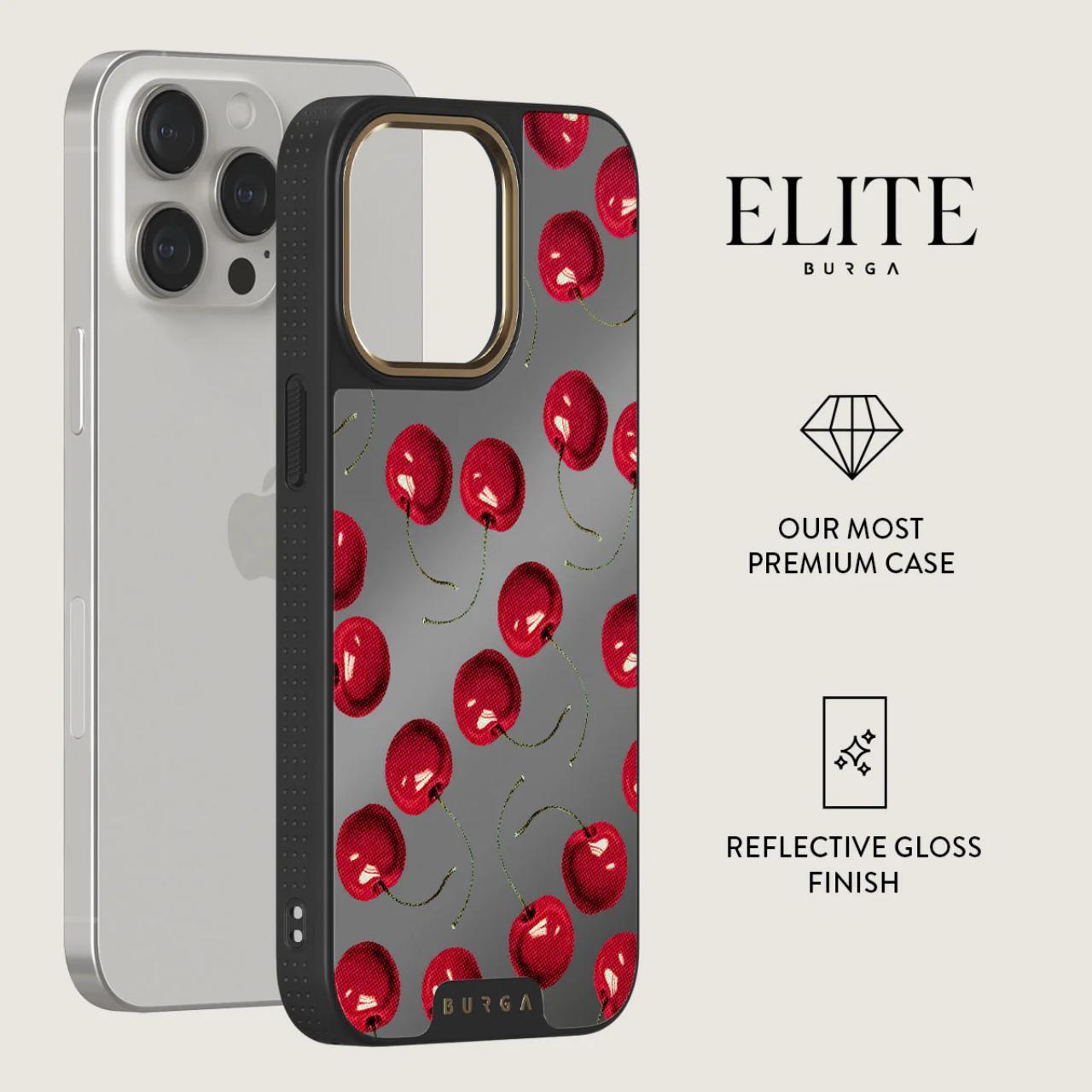 Funda Elite Mirror Magsafe Gold Cherrybomb para iPhone 15 Pro de Burga, diseñada para absorber impactos y ofrecer protección, cuenta con la última tecnología CloudGuard y un elegante acabado efecto espejo. El interior de microfibra mantiene el teléfono cómodo y evita rayones.