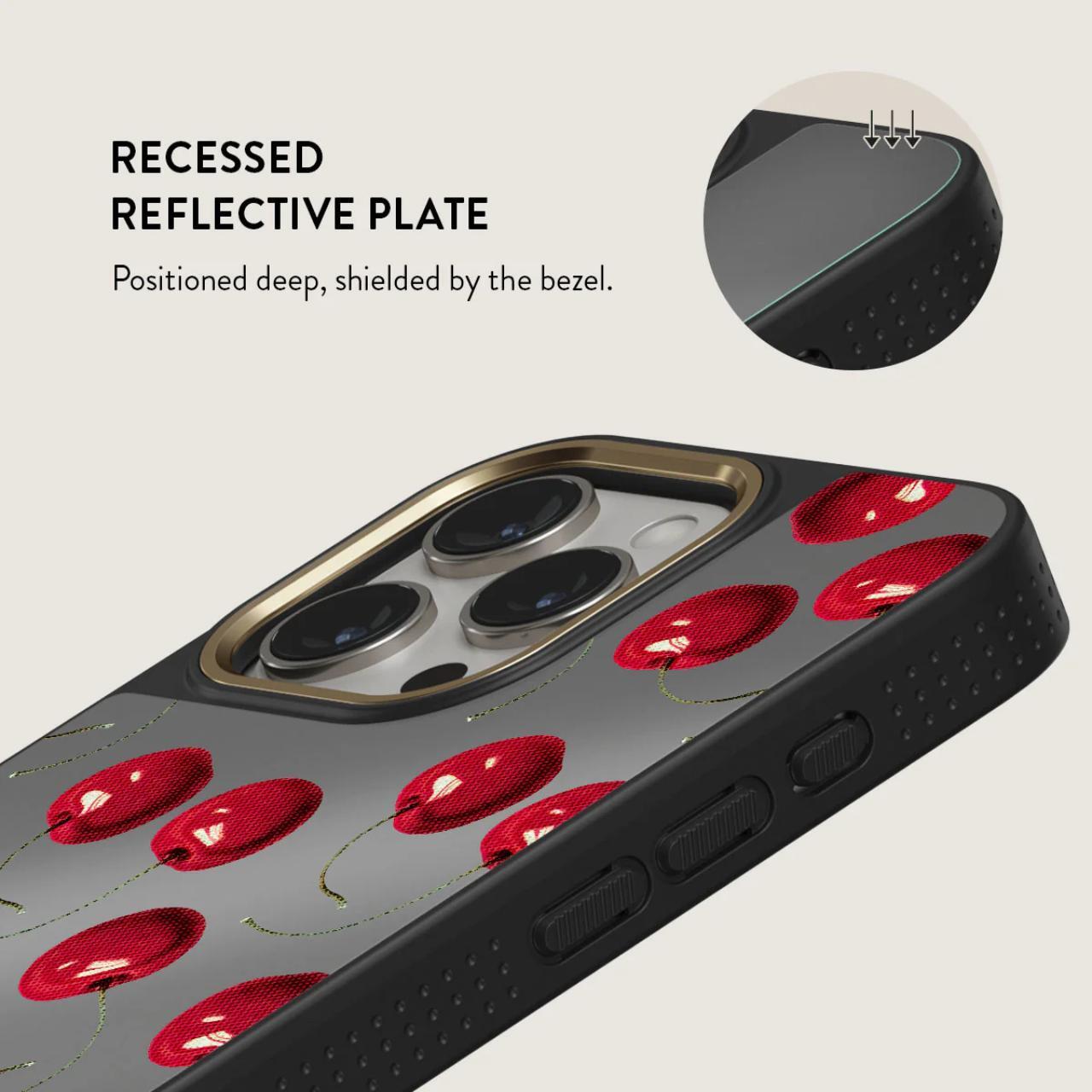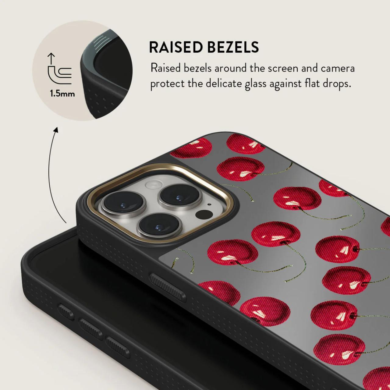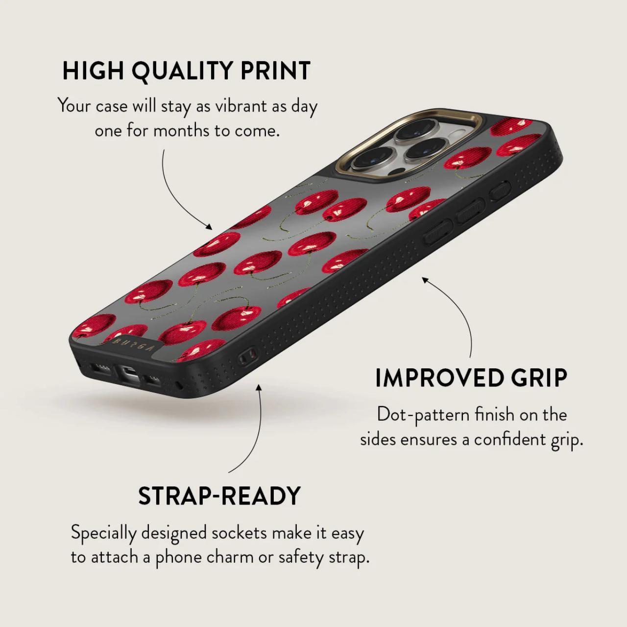 Cherrybomb: sobre un fondo negro intenso, destacan cerezas rojas. Tentador y audaz, el diseño de nuestra funda para iPhone 15 Pro es perfecto para quienes prefieren lo simple pero llamativo.